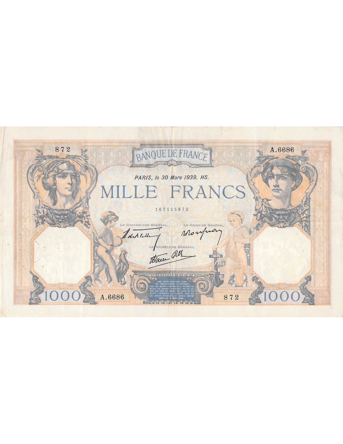 FRANCE, CÉRÈS ET MERCURE - 1000 FRANCS 30/03/1939 - SÉRIE A.6686