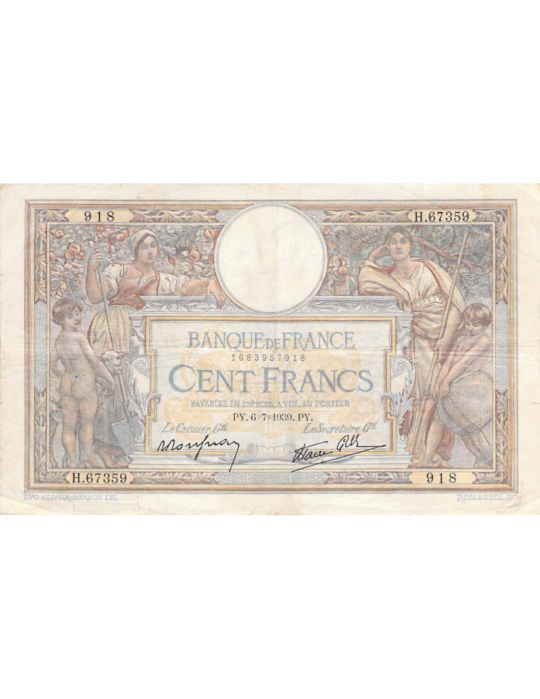 FRANCE, LUC-OLIVIER MERSON - 100 FRANCS 06/07/1939 - TB+