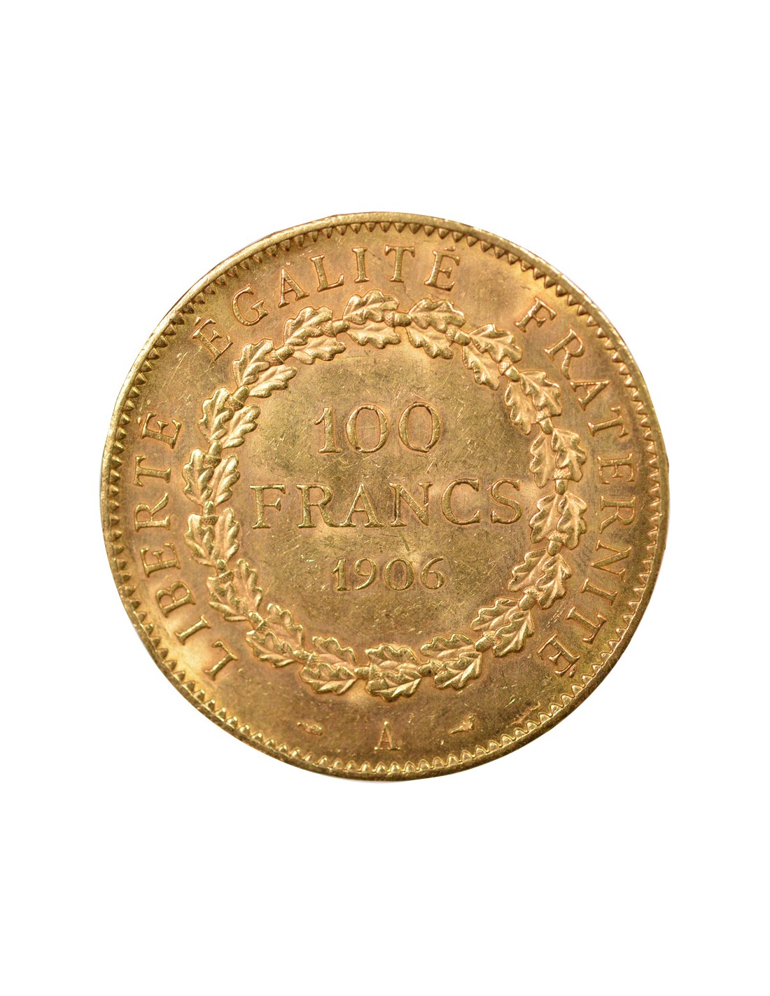 Cette pièce est une pièce de monnaie française d'une valeur nominale de 100 francs. Elle est frappée en or et a été produite à l'atelier de Paris, identifié par la lettre "A". L'année d'émission est 1906.