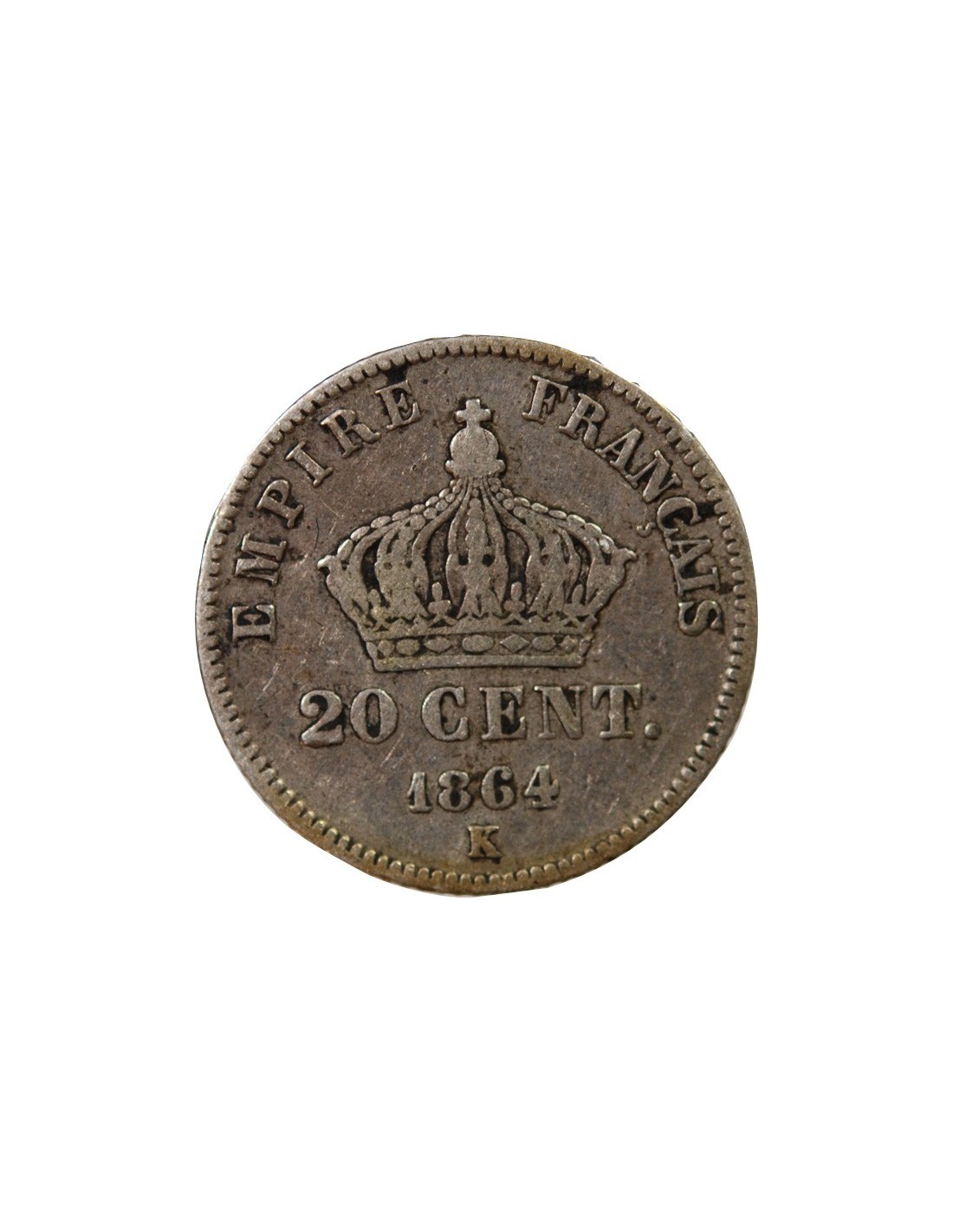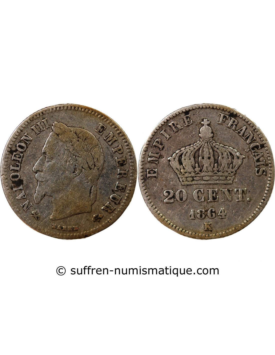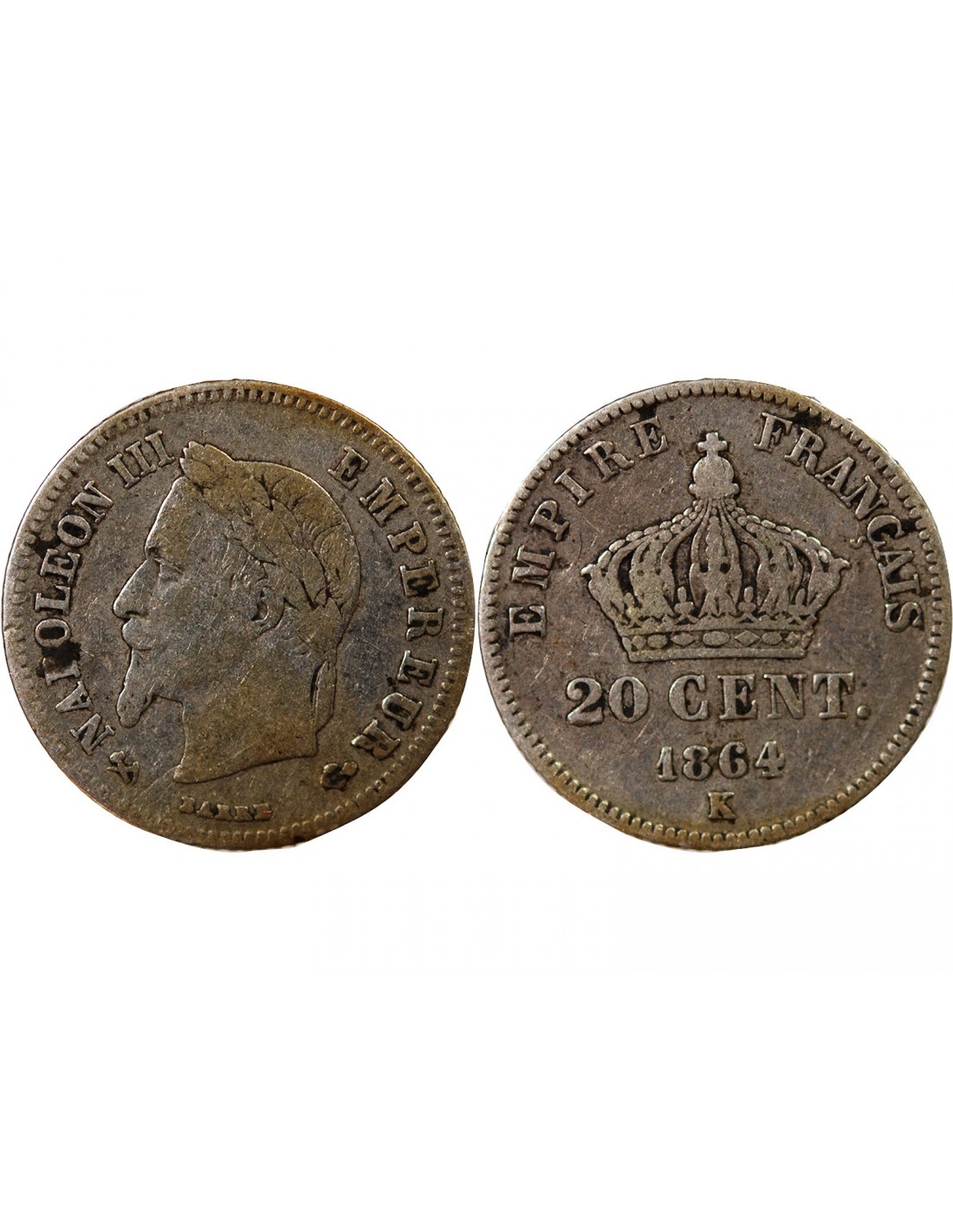 NAPOLEON III, TÊTE LAURÉE - 20 CENTIMES ARGENT 1864 K BORDEAUX