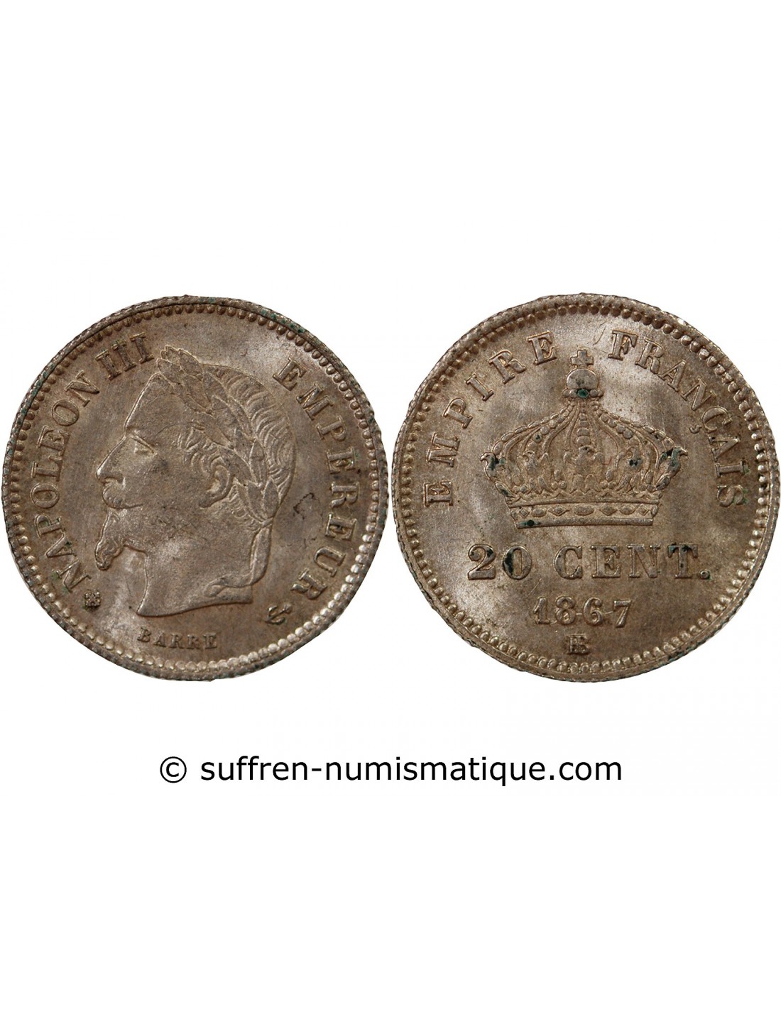 NAPOLEON III, TÊTE LAURÉE - 20 CENTIMES ARGENT 1867 BB STRASBOURG