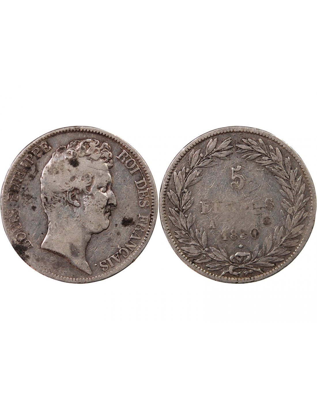 LOUIS PHILIPPE - 5 FRANCS 1830 A PARIS "Tiolier sans le I, Tr creux"