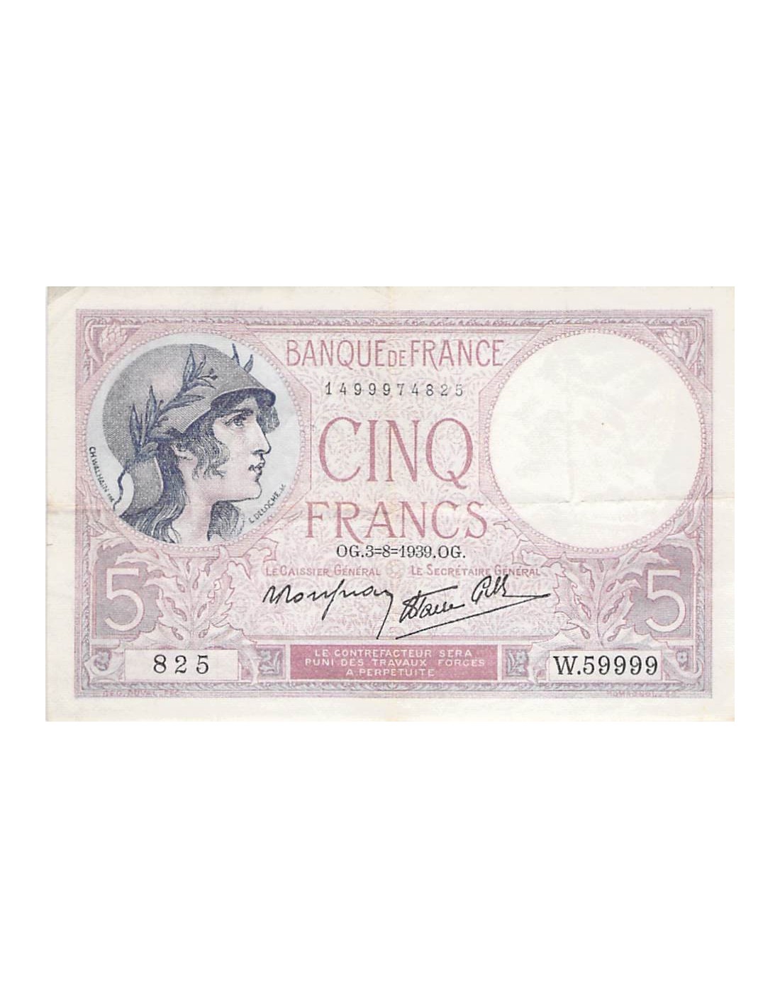 FRANCE - 5 FRANCS VIOLET 03/08/1939 - SÉRIE W.59999 - TTB