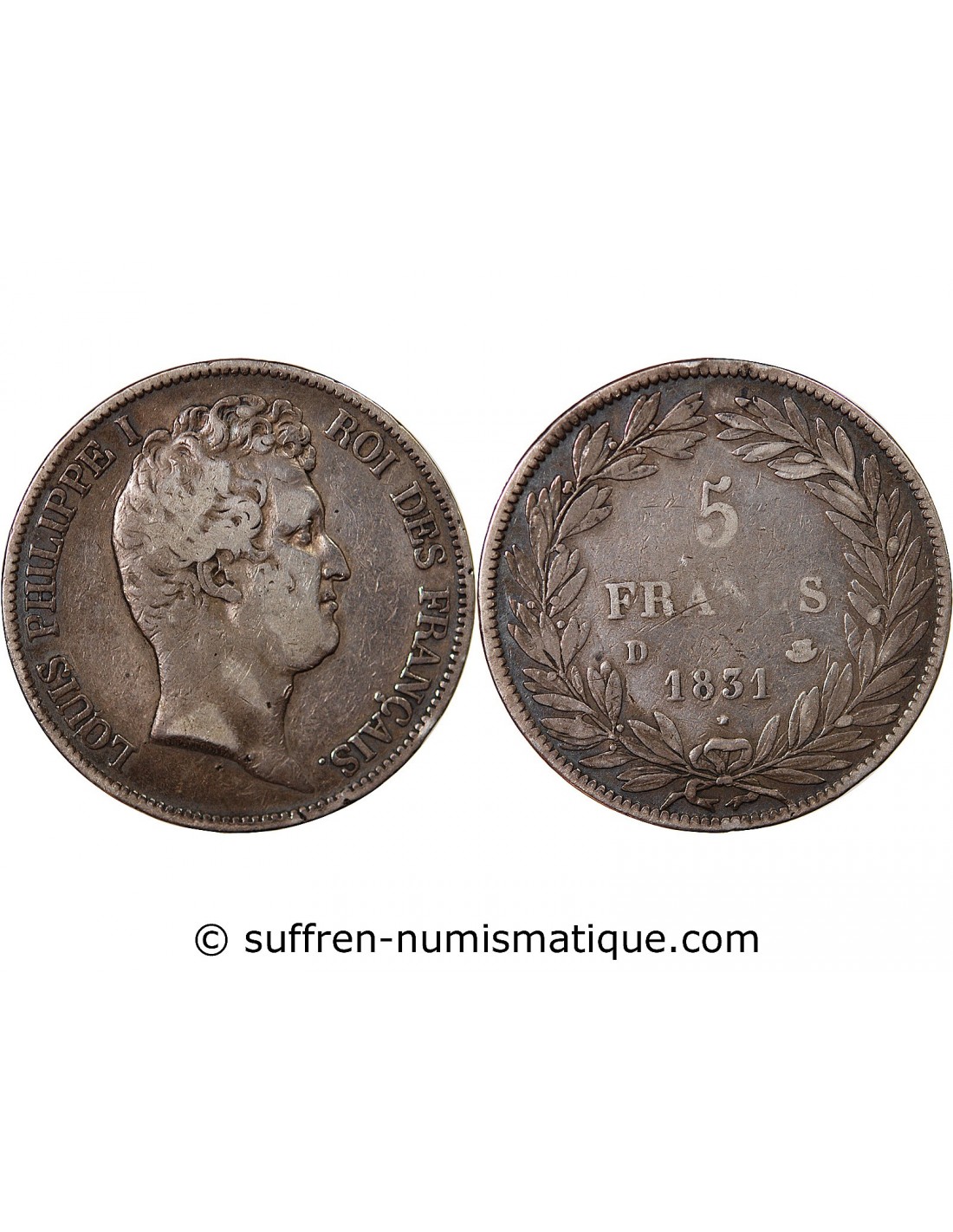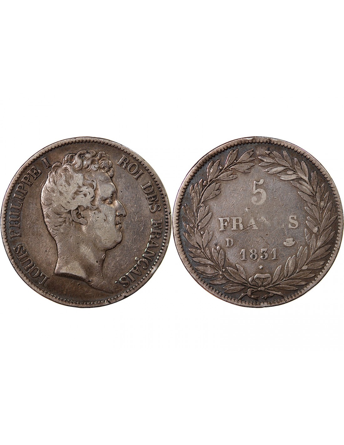 LOUIS PHILIPPE - 5 FRANCS ARGENT 1831 D LYON "Type Tiolier, Tr creux"