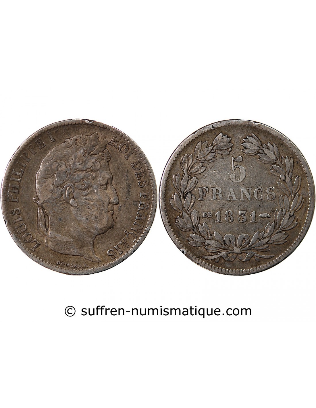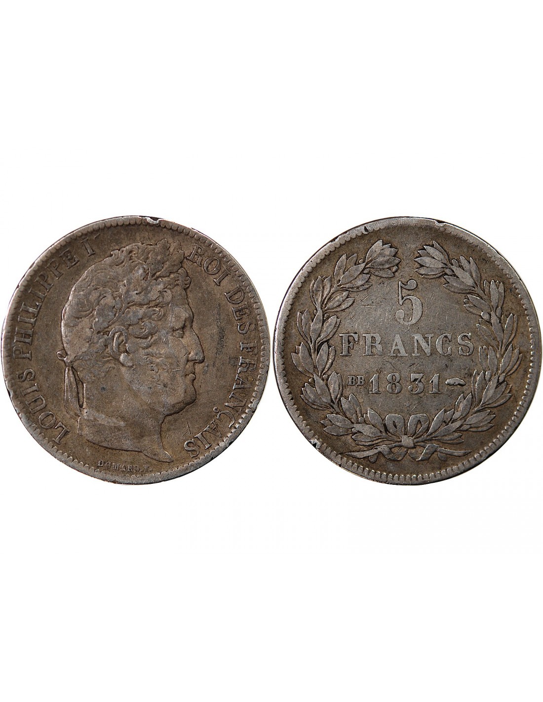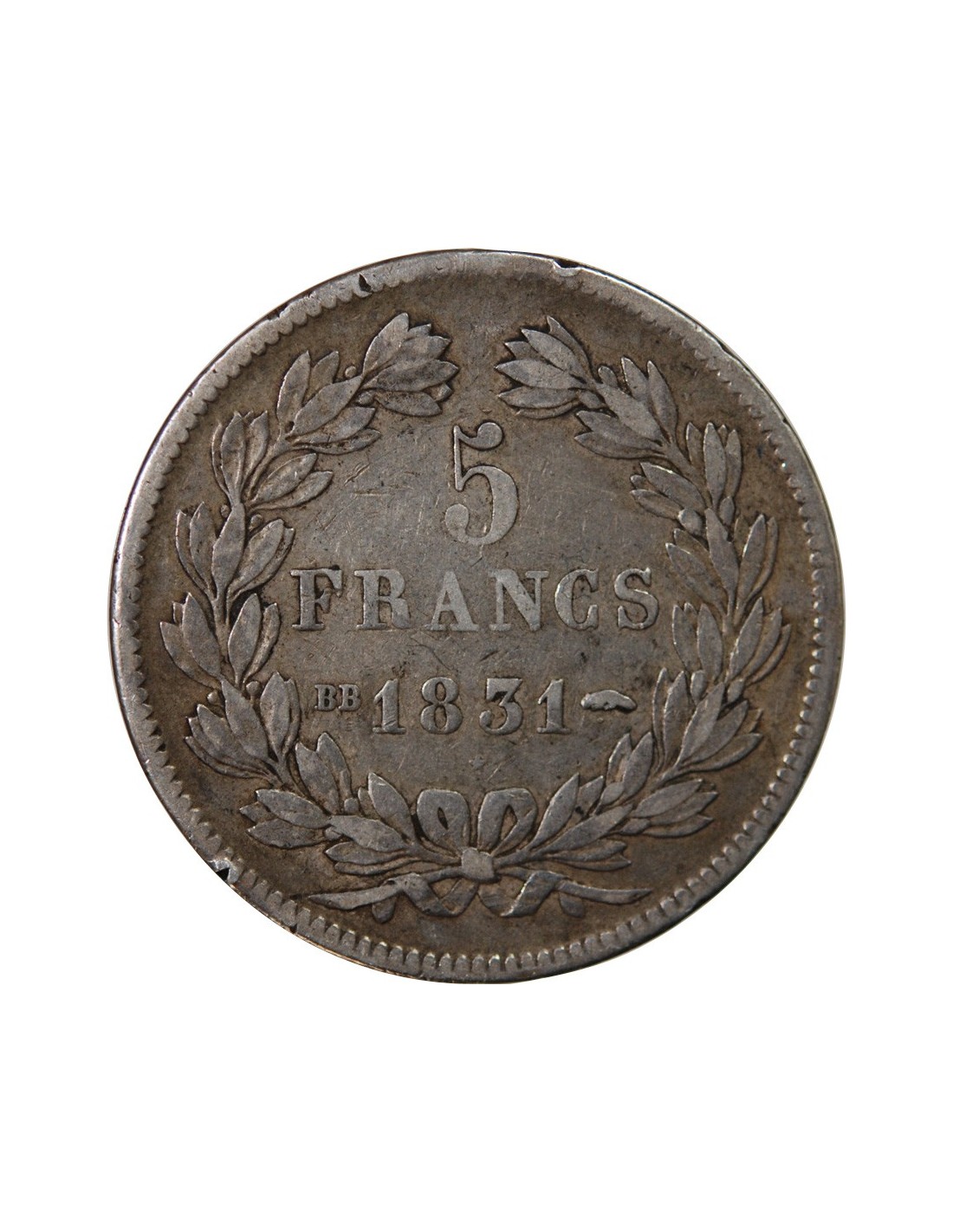 LOUIS PHILIPPE - 5 FRANCS 1831 BB STRASBOURG "Tranche en creux"