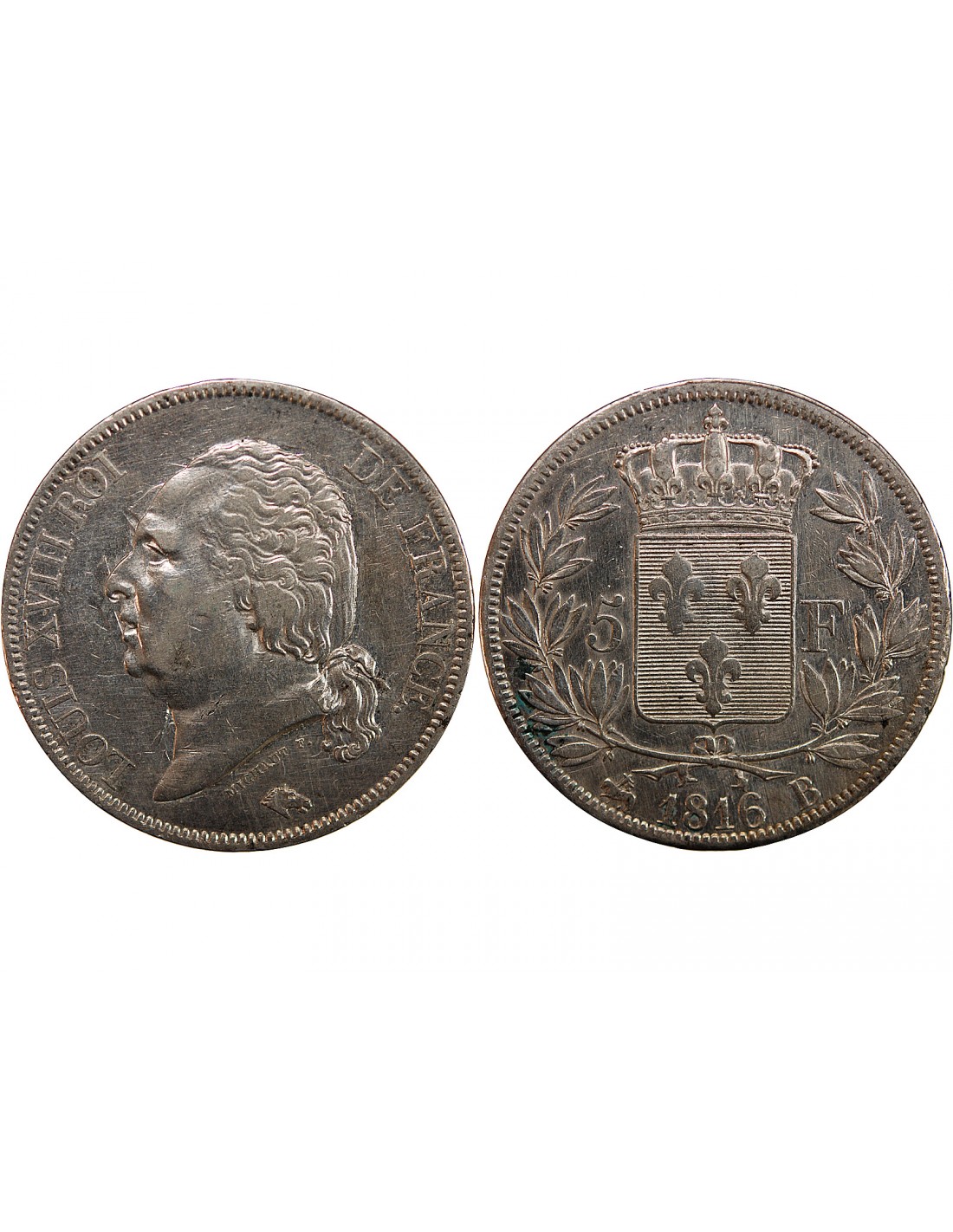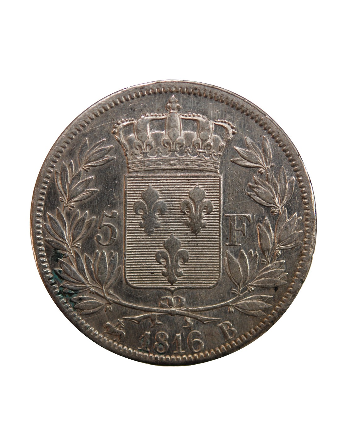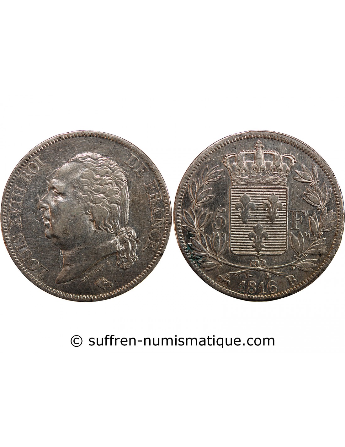 LOUIS XVIII - 5 FRANCS ARGENT 1816 B ROUEN
