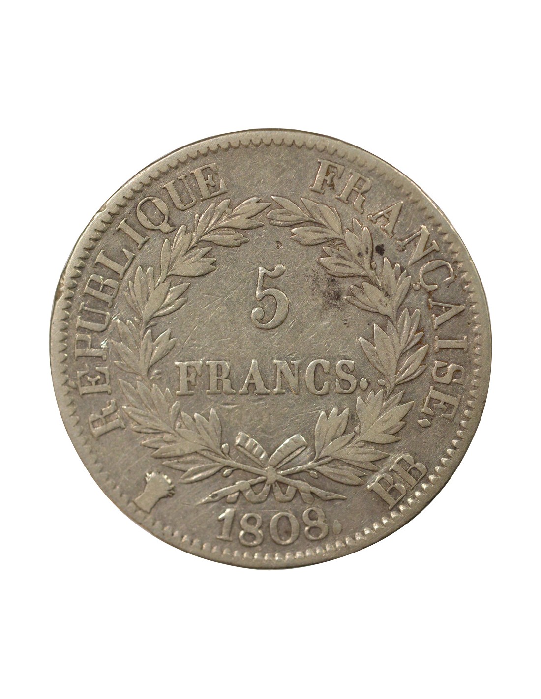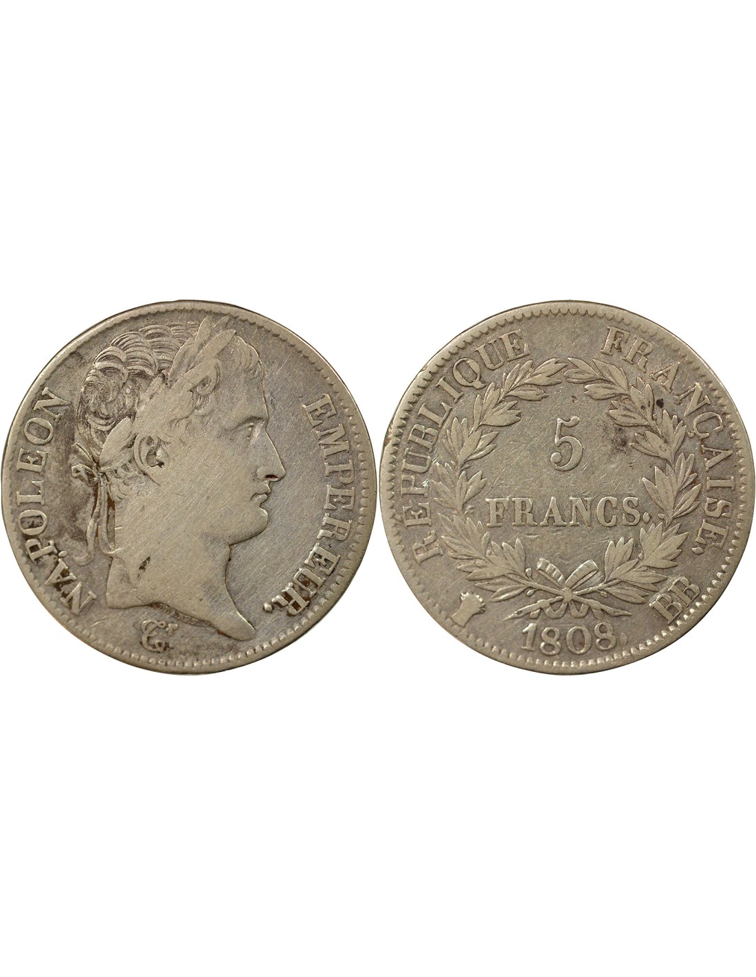 France Napoléon I - 5 Francs Argent, Tête laurée, République - 1808 BB Strasbourg