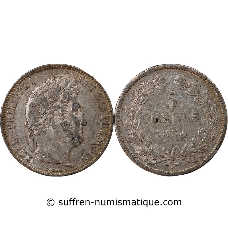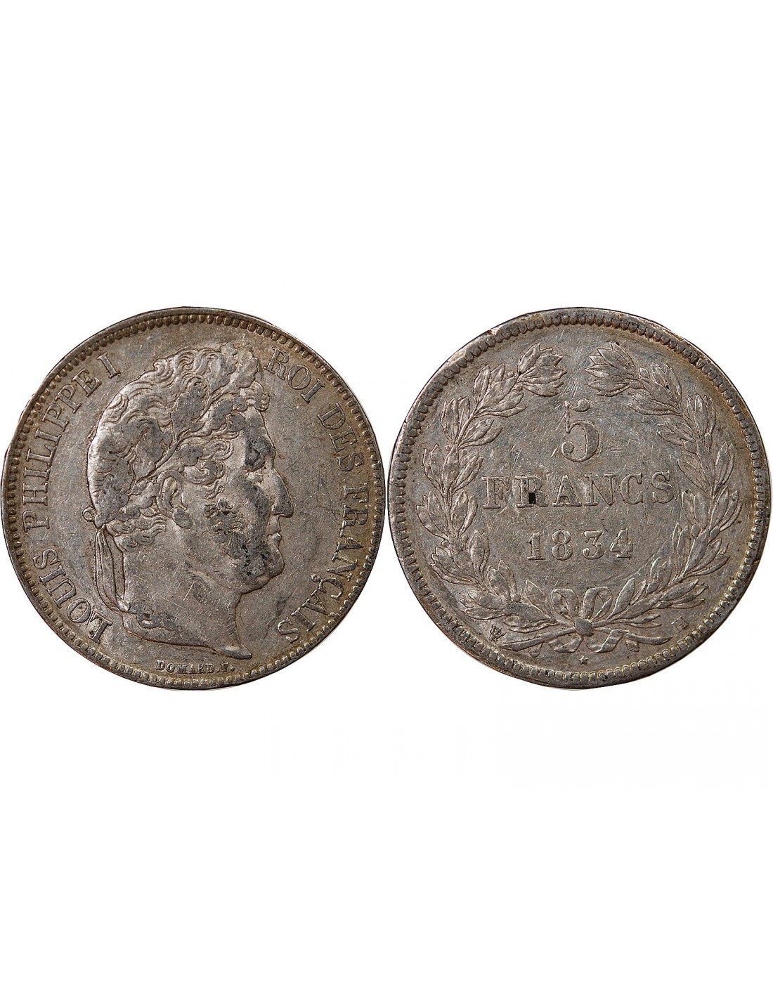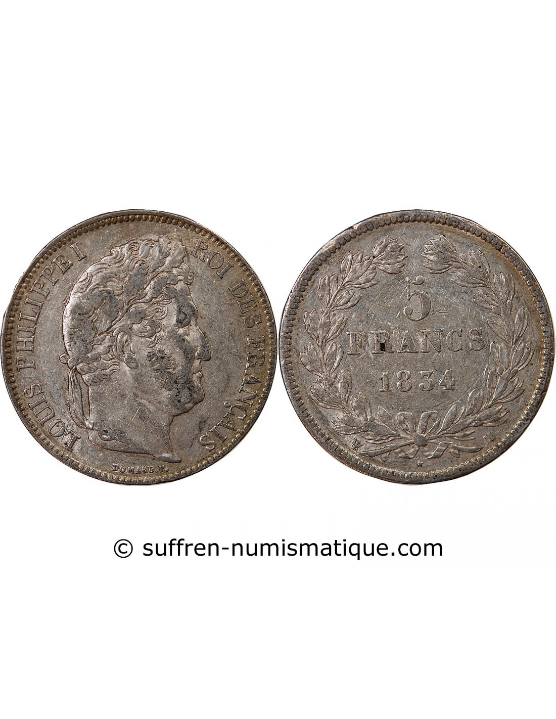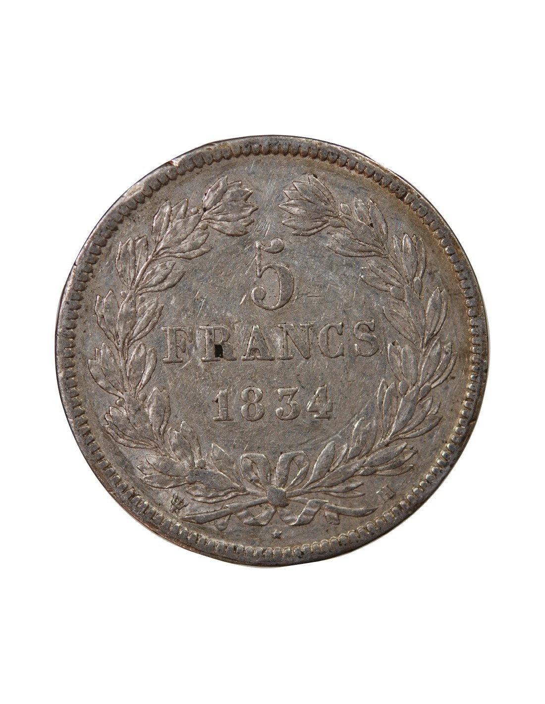 LOUIS PHILIPPE - 5 FRANCS ARGENT 1834 H LA ROCHELLE "Type Domard, Tr relief"