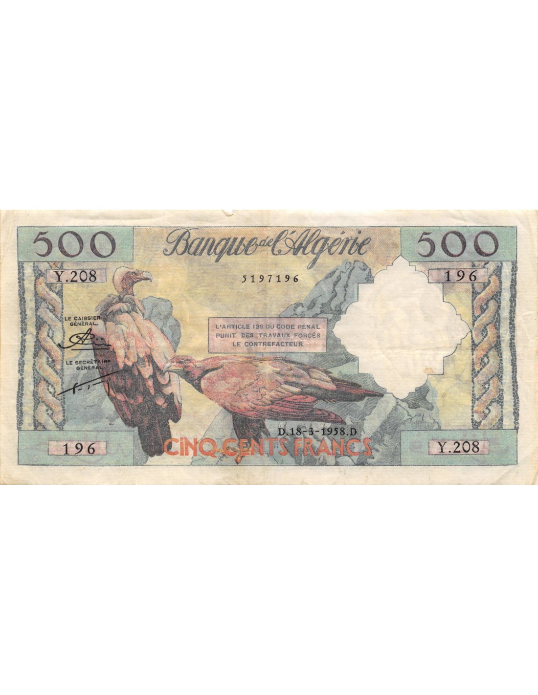 Vendu Afrique du Nord Algérie 5 NF - Bacchus - 31-07-1959 - Série E.19 SUFFREN SFB258 30,00 € épinglages, plis, salissures, petit manque en coin View