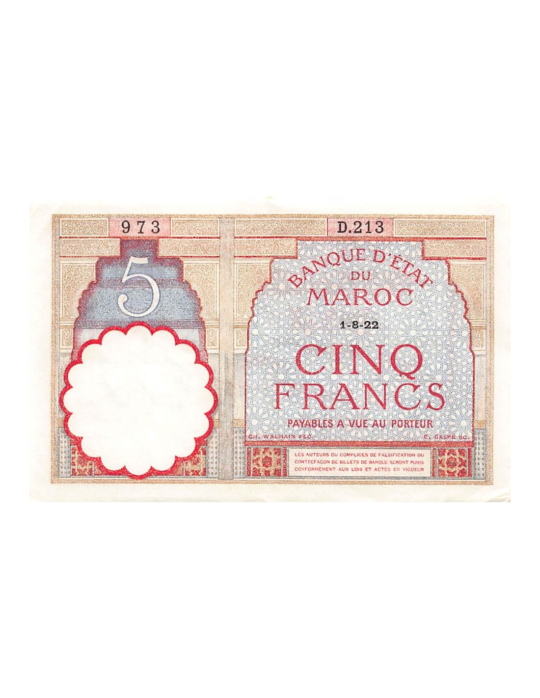 MAROC, BANQUE D'ETAT - 5 FRANCS 01/08/1922 - SÉRIE D.213