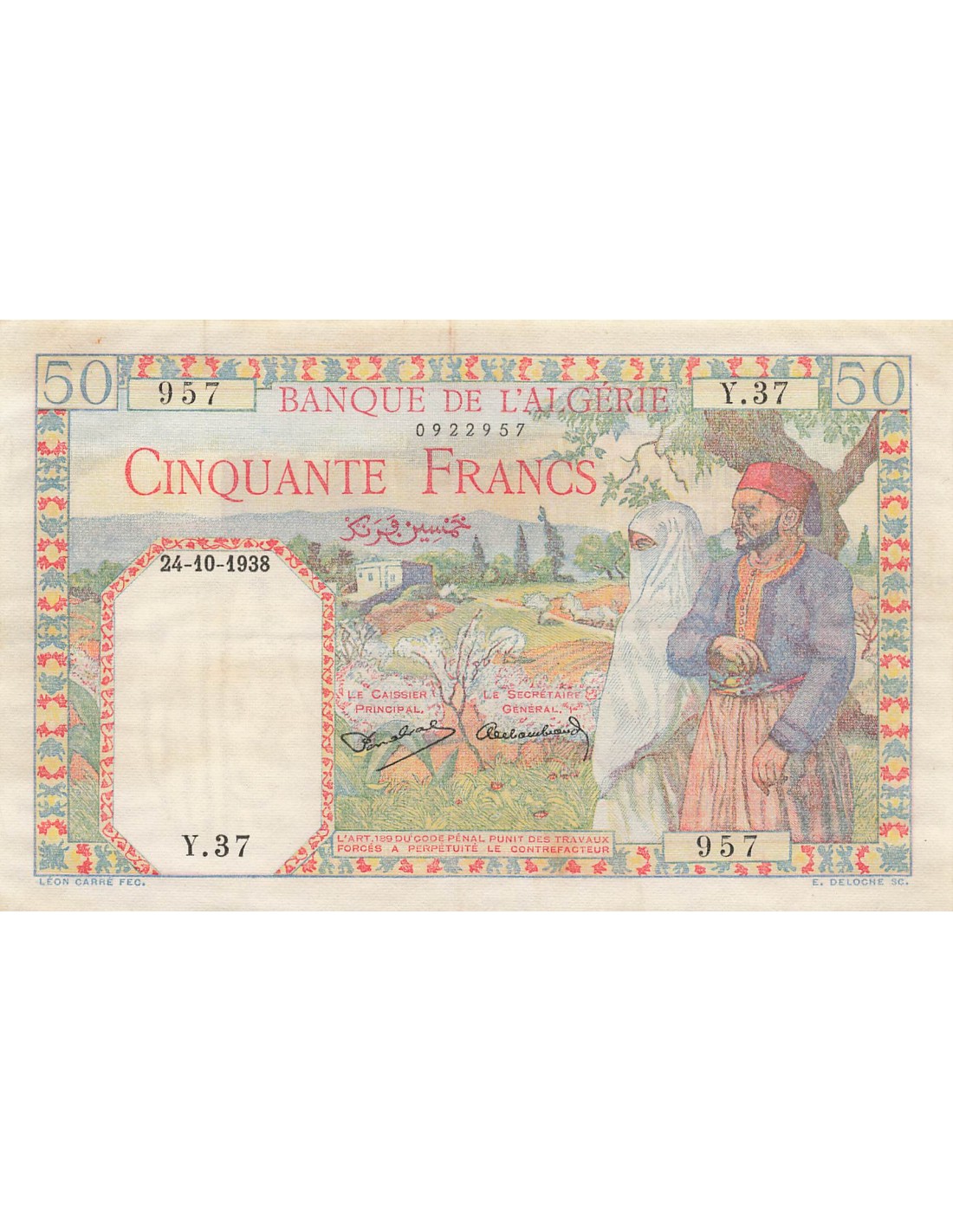 Vendu Afrique du Nord Algérie 50 Francs - Couple - 02-01-1938 - Filigrane Tête - P.84 SUFFREN SFB736 25,00 € View