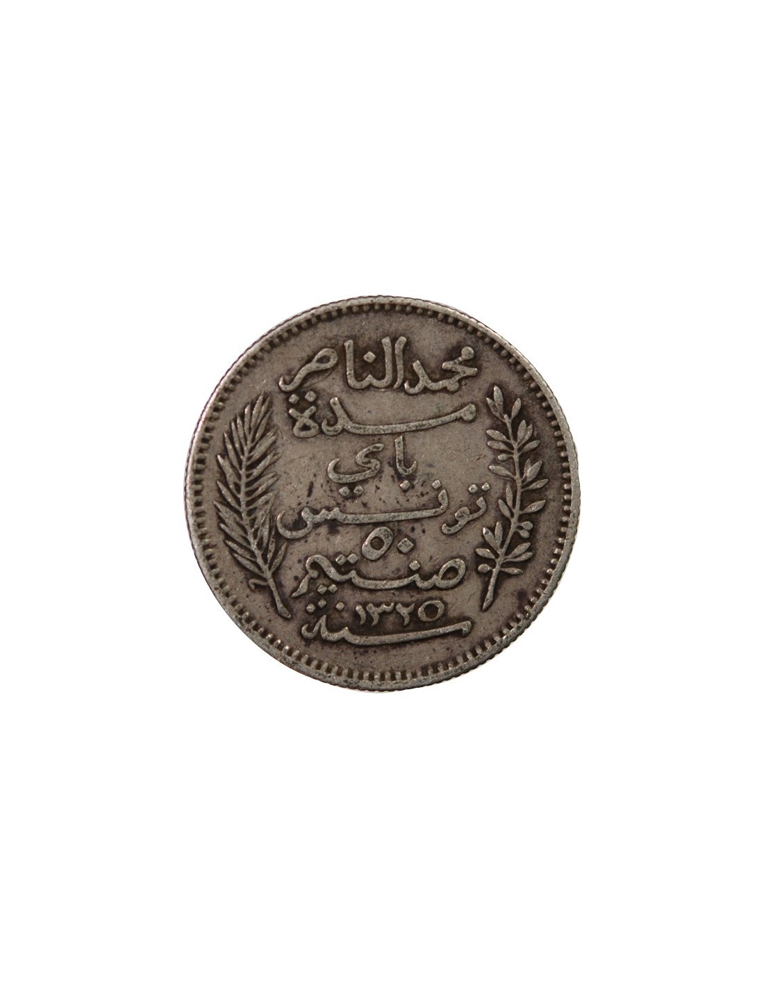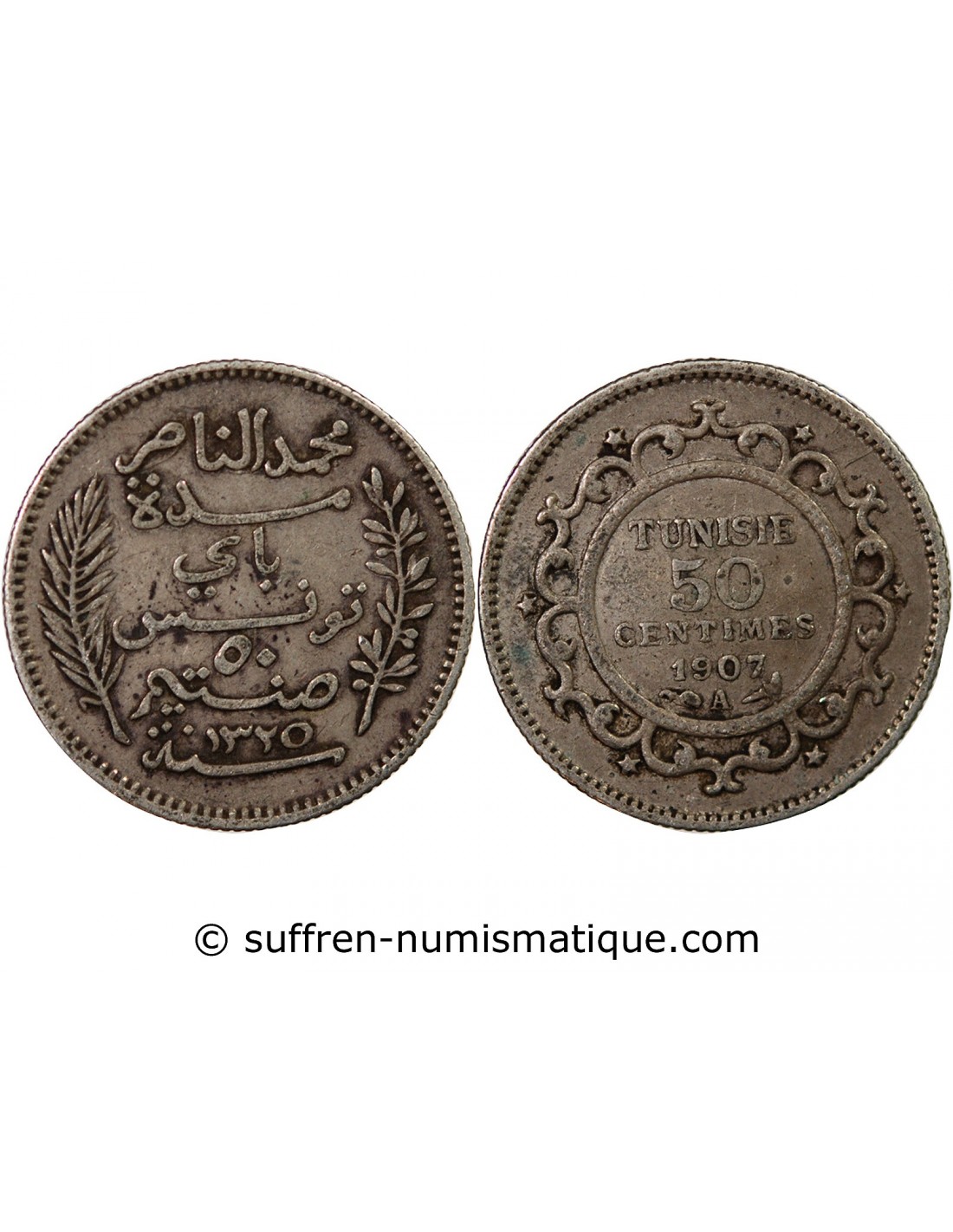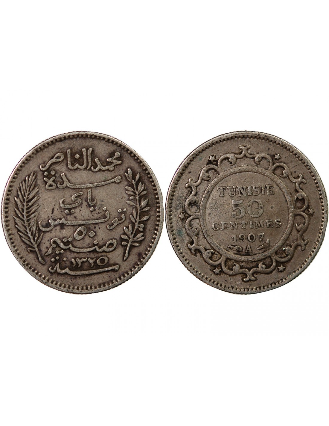 TUNISIE, MUHAMMAD AL-NASIR - 50 CENTIMES ARGENT 1907 A PARIS