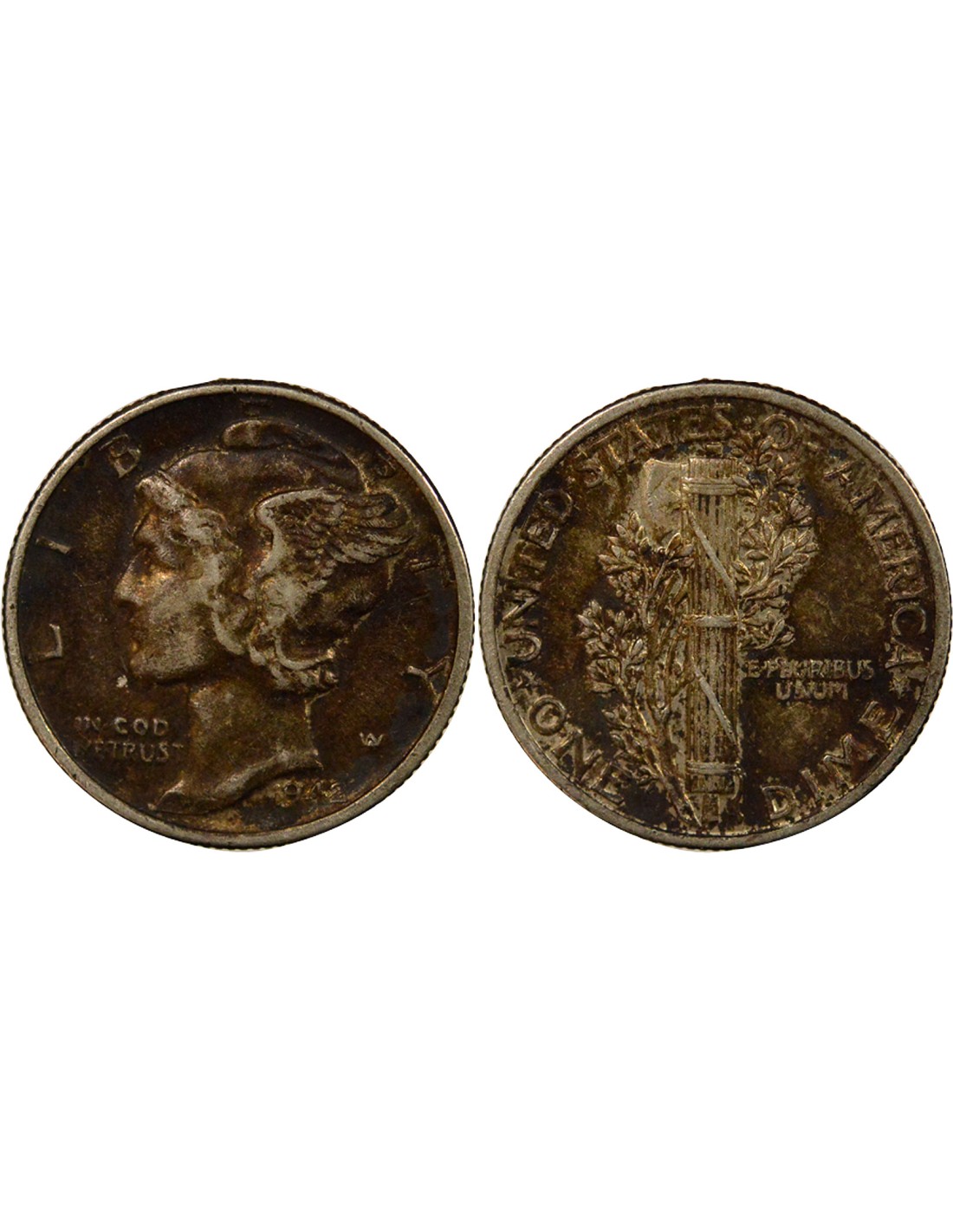Cette pièce est un dime américain en argent, frappée à Philadelphie en 1942. Sa valeur nominale est de 1 dime. Le dime est une unité monétaire des États-Unis.