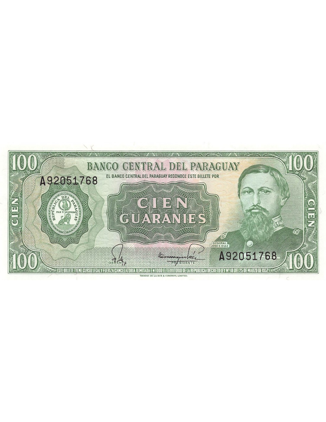 PARAGUAY, GENERAL JOSE E. DIAZ - 100 GUARANIES LOI DE 1952 - P.NEUF