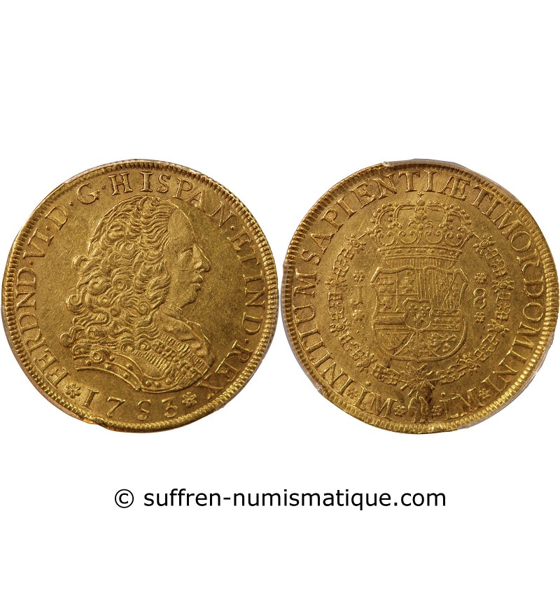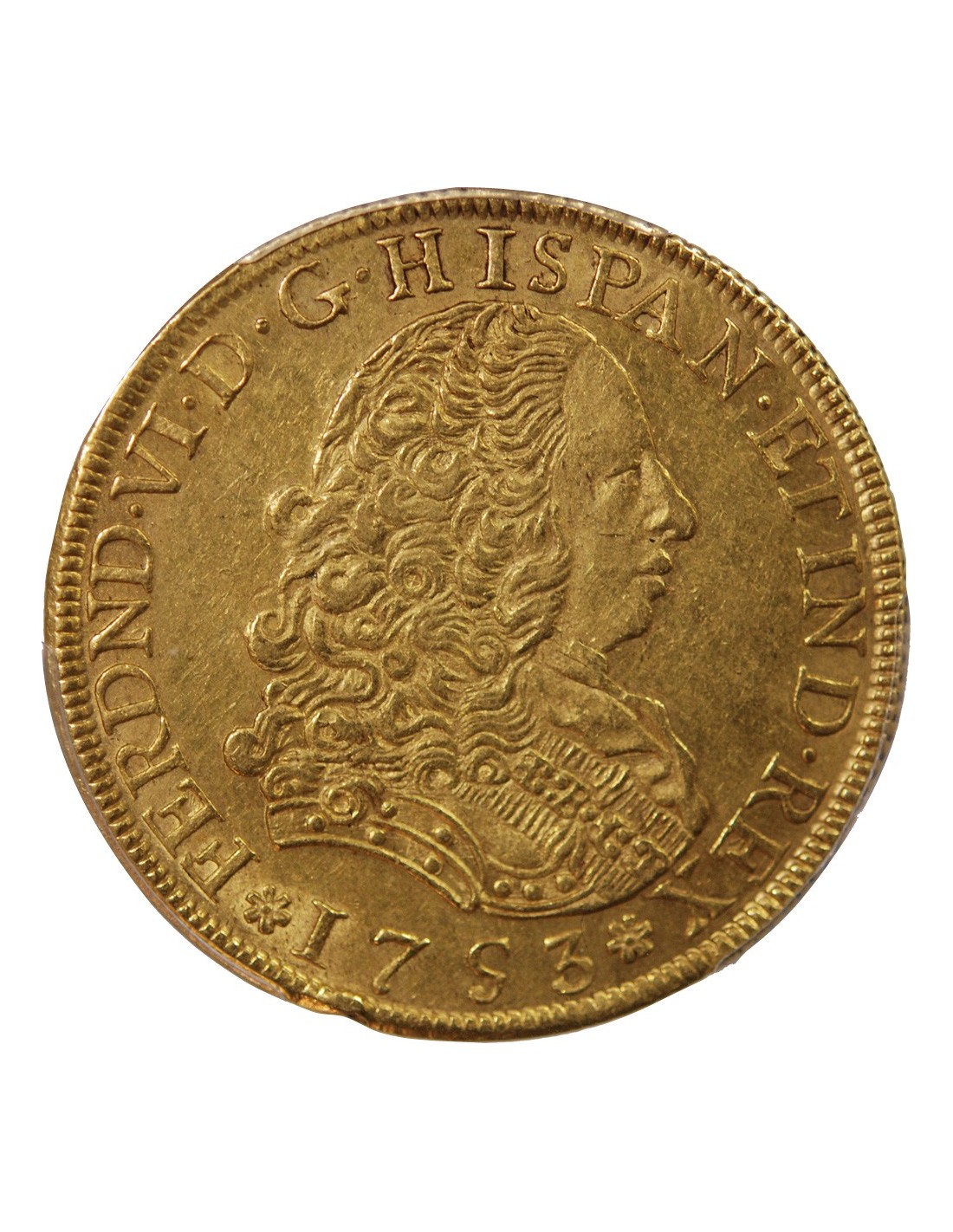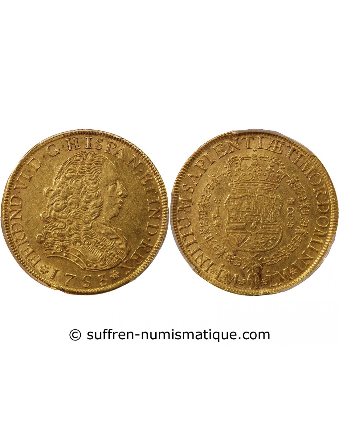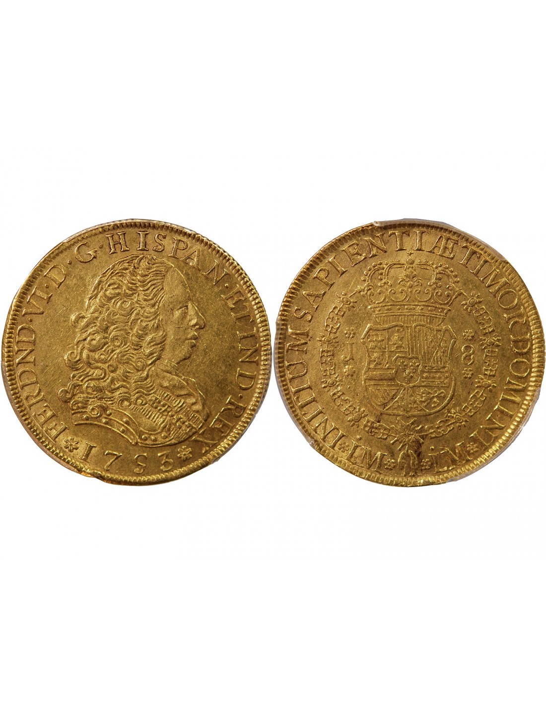 PEROU, FERDINAND VI - 8 ESCUDOS OR LMJ - PCGS AU53
