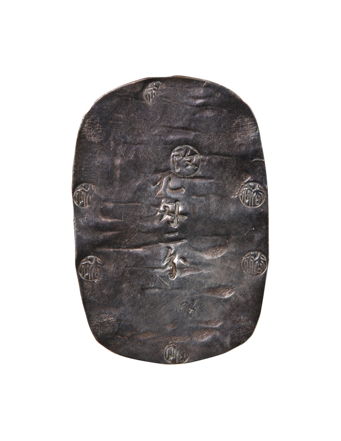 Plaque d'argent reprenant la forme du Koban, émise au cours de la troisième année de l'ère Bunkyu comme lingot à Akita dans la Province de Dewa afin de circuler comme moyen de paiement pour son poids.