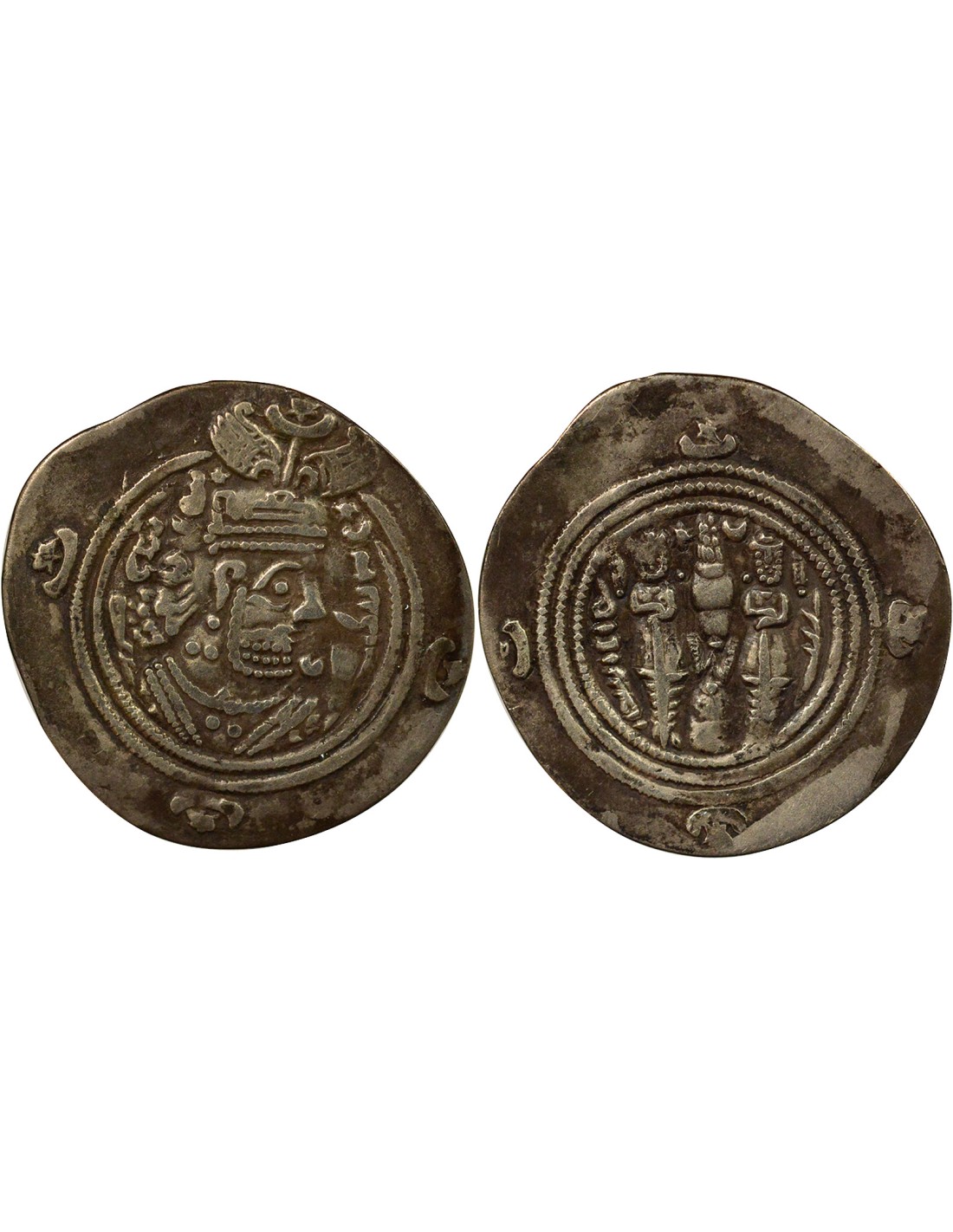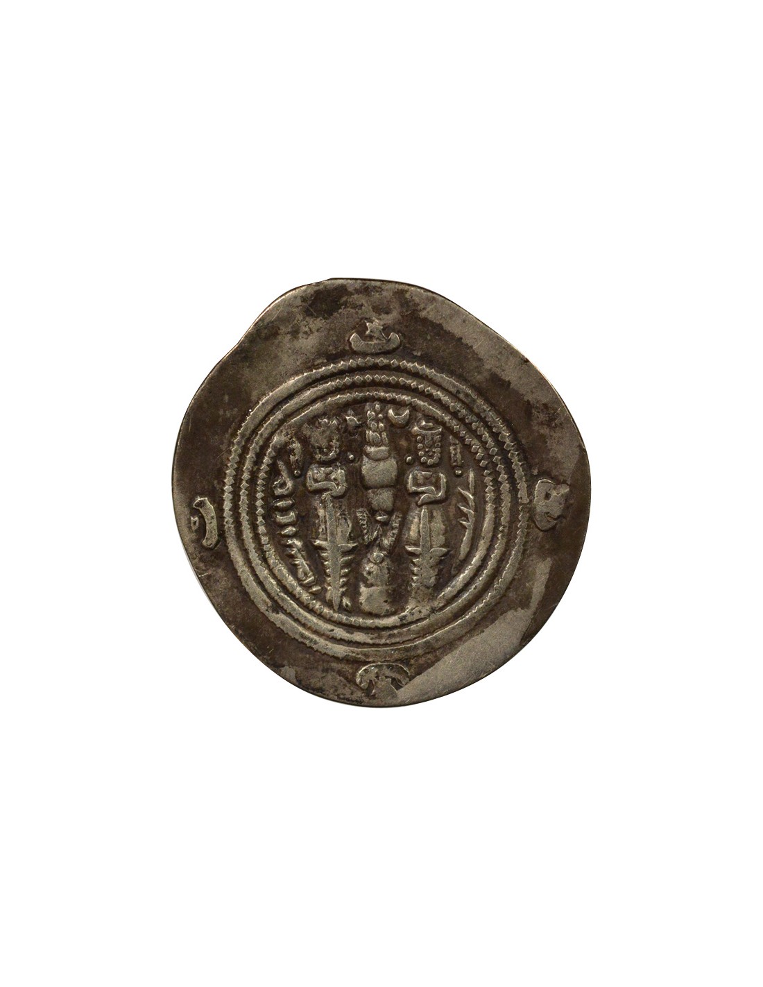 L'iconographie de la pièce est typique des drachmes sassanides. L'avers présente le buste de Chosroès II, coiffé d'une couronne complexe ornée de symboles royaux. Le roi est représenté de profil, avec une barbe soignée et des détails précis dans la gravure de ses traits. Son nom en alphabet pehlevi, la langue administrative de l'empire sassanide, entourent le buste.
