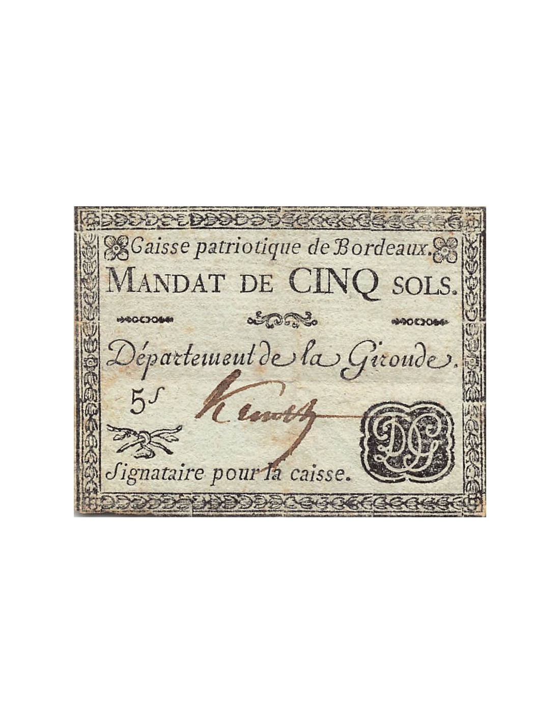 ASSIGNAT, CAISSE PATRIOTIQUE DE BORDEAUX - MANDAT DE 5 SOLS 1790 / 1793 - TTB+