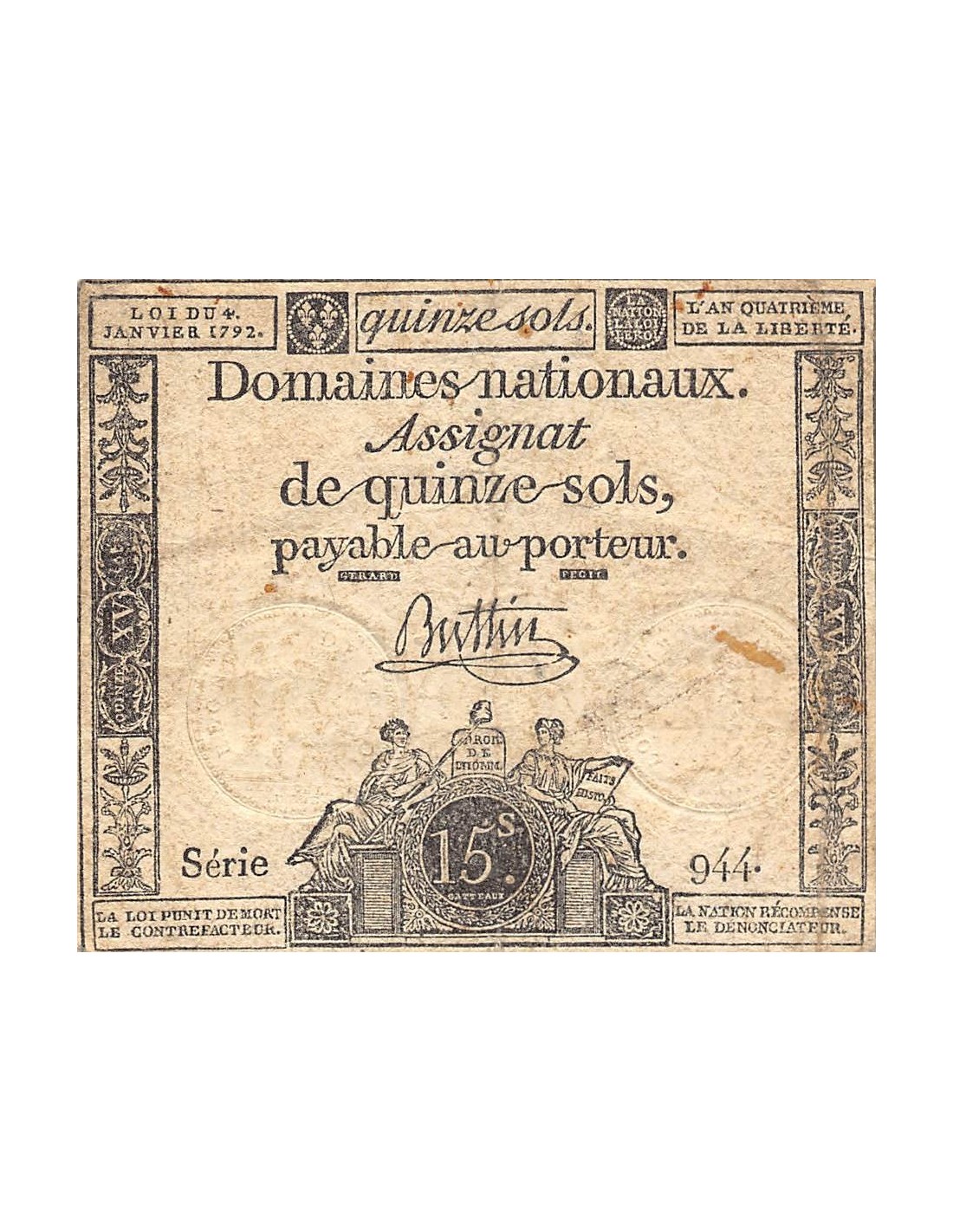 RÉVOLUTION FRANCAISE, ASSIGNAT - 15 SOLS - LOI DU 04/01/1792 - TB+