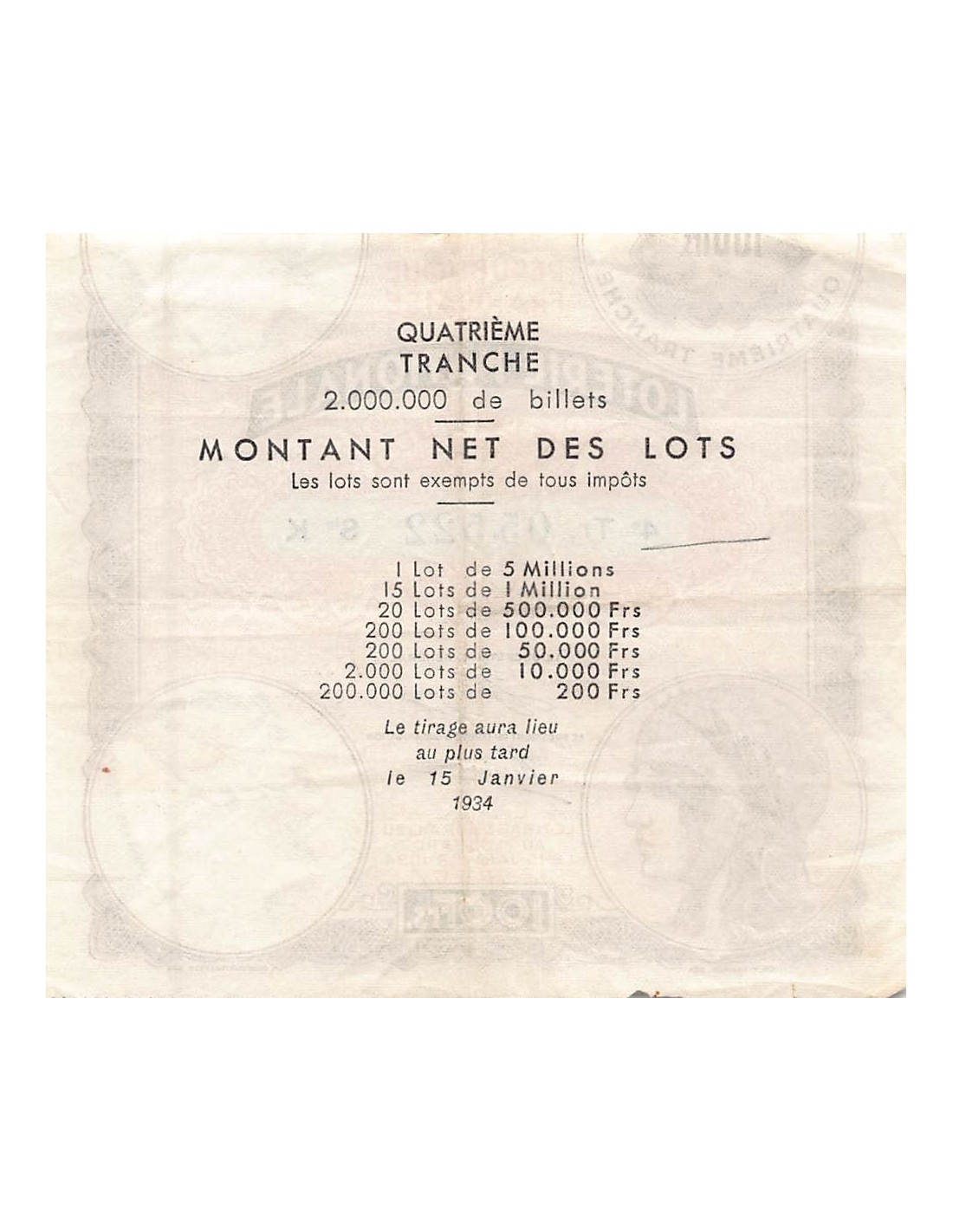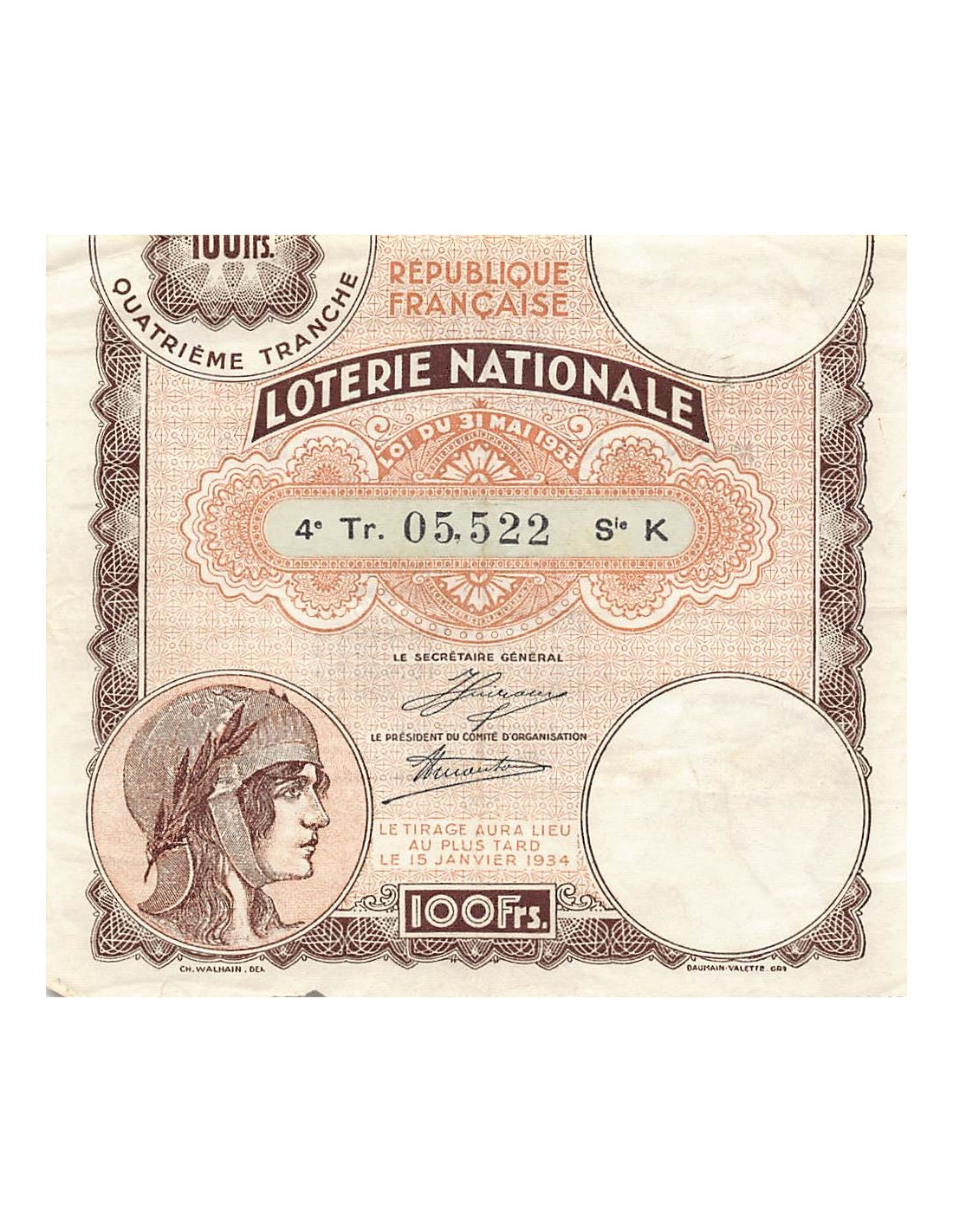 Billet de Loterie Nationale, 100 FRANCS 15 Janvier 1934