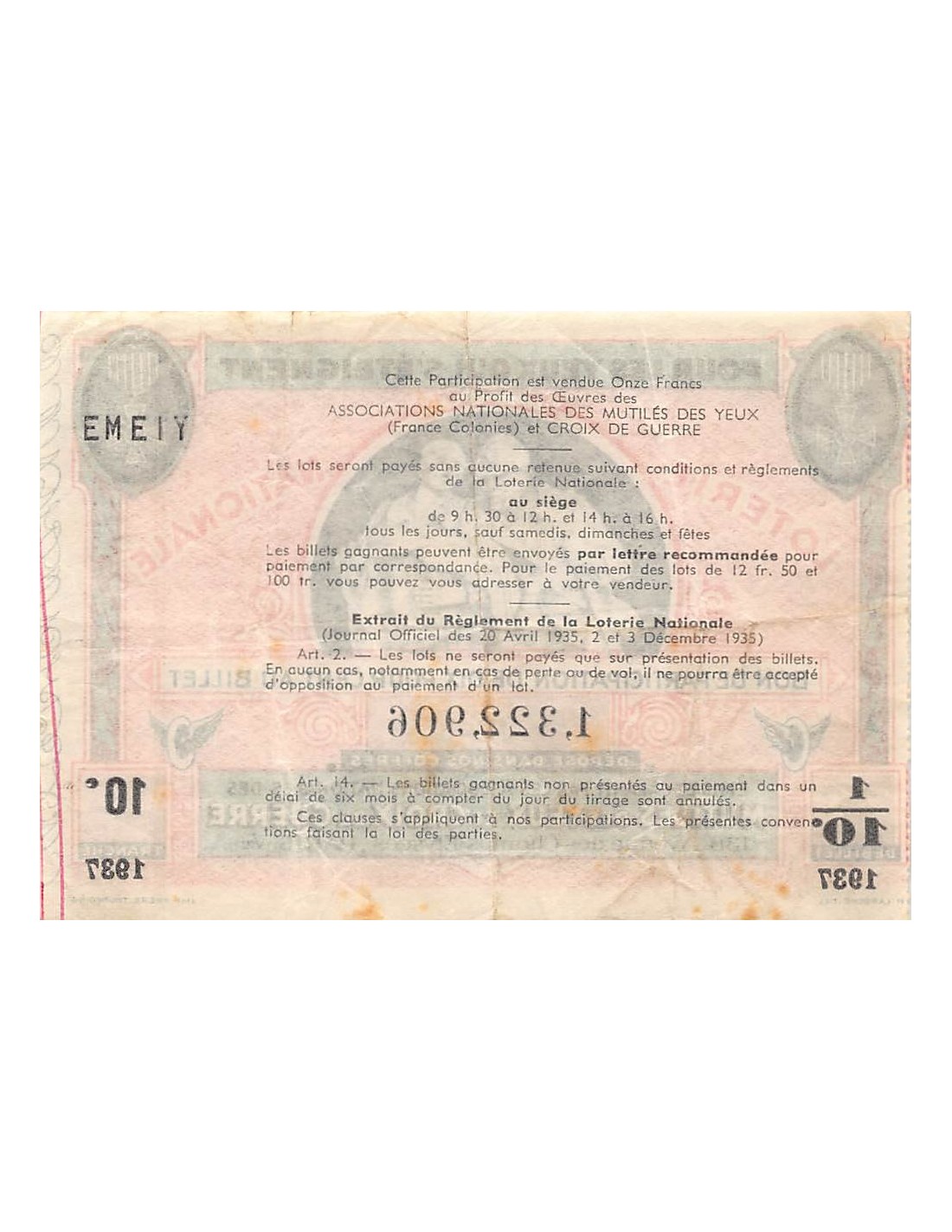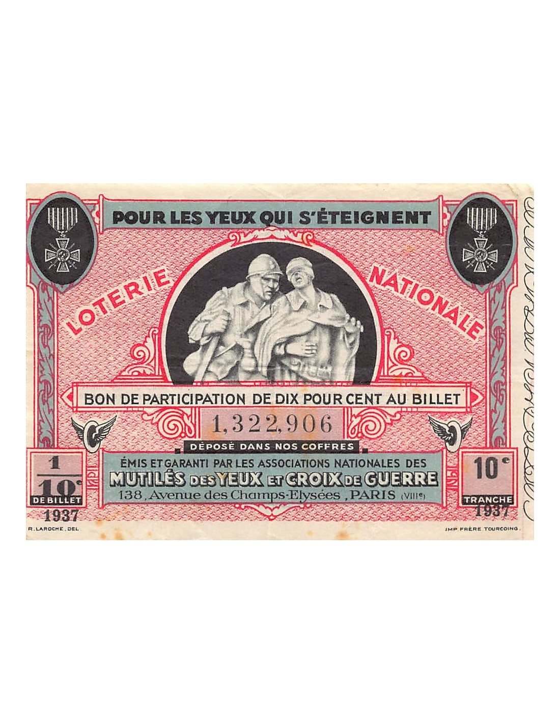 Billet de Loterie Nationale, Mutilés des yeux et croix de guerre - 1937