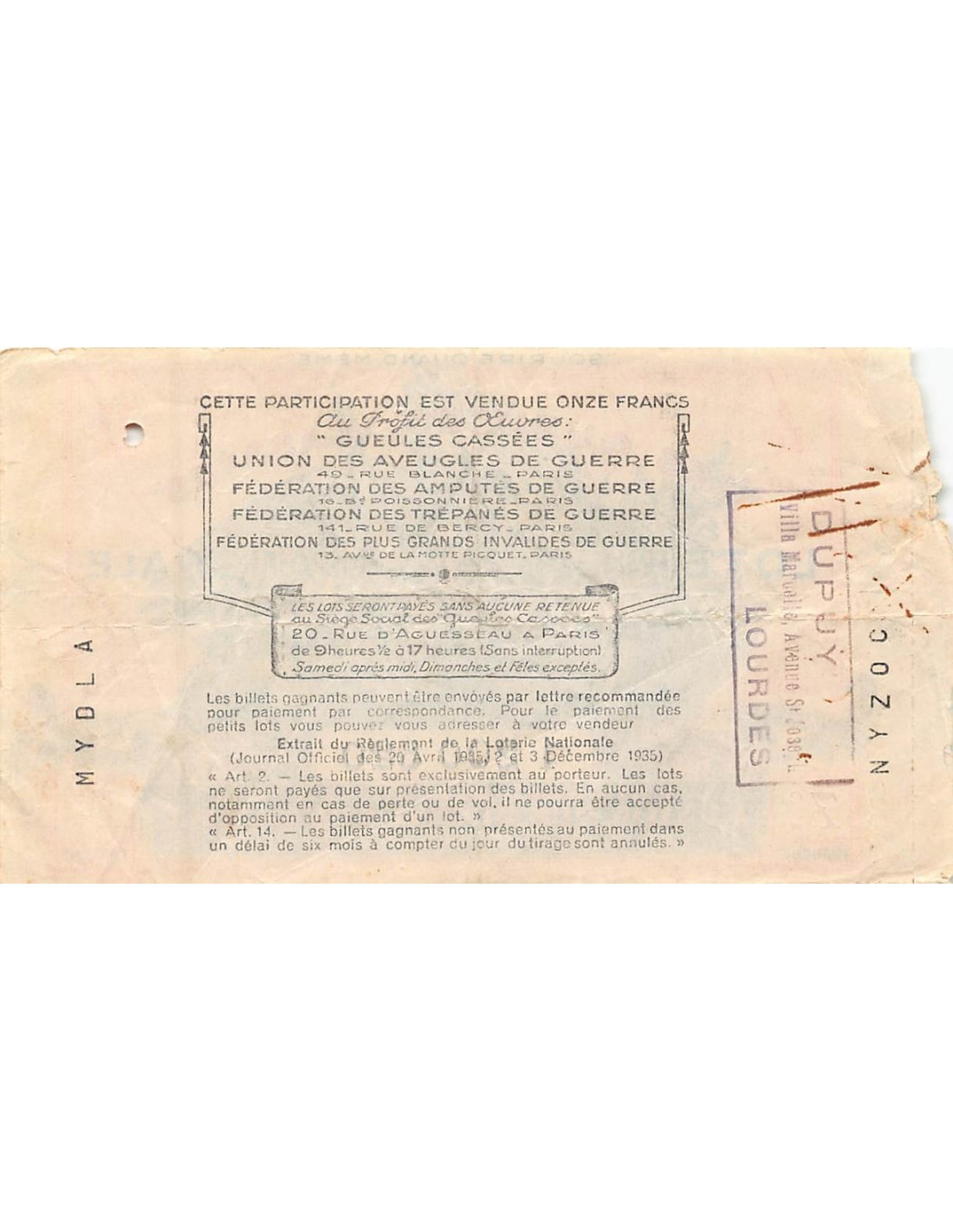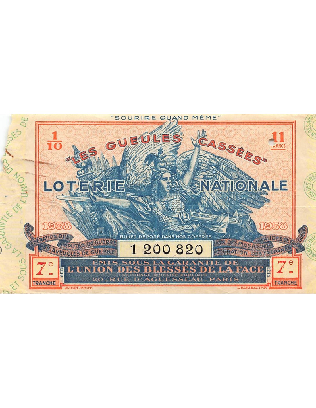 Billet de Loterie Nationale, Les Gueules Cassées - 1938