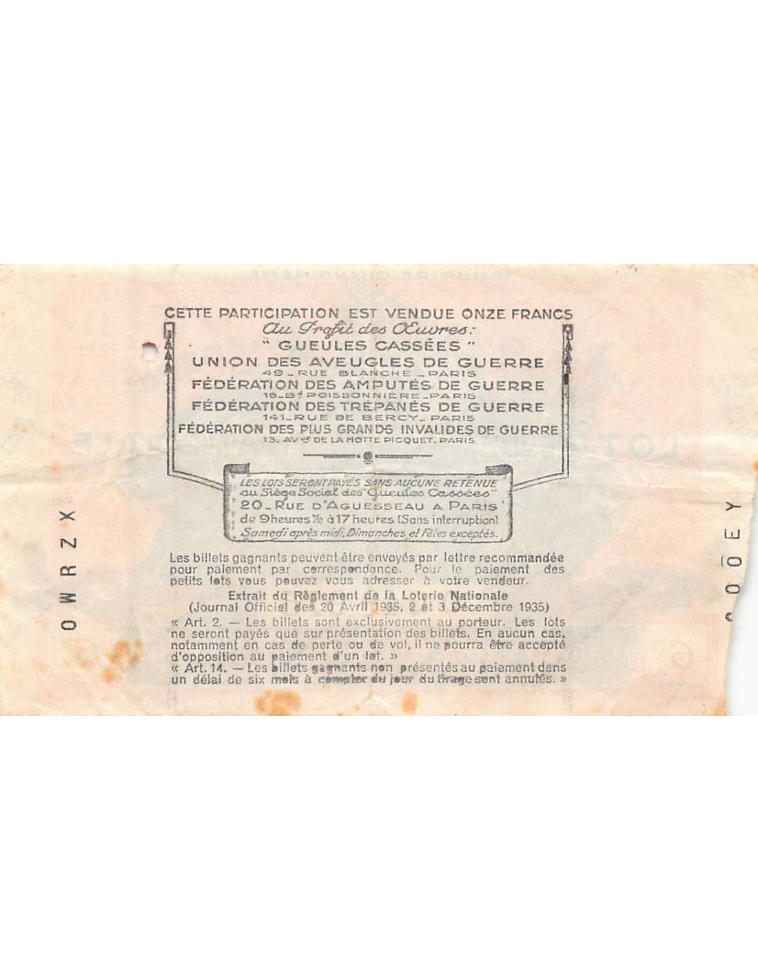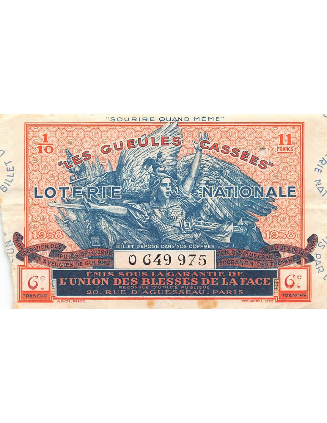 Billet de Loterie Nationale, Les Gueules Cassées - 1938