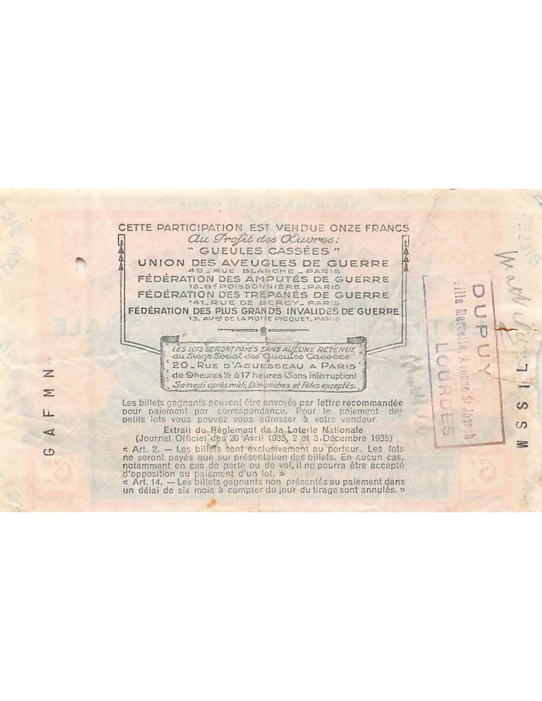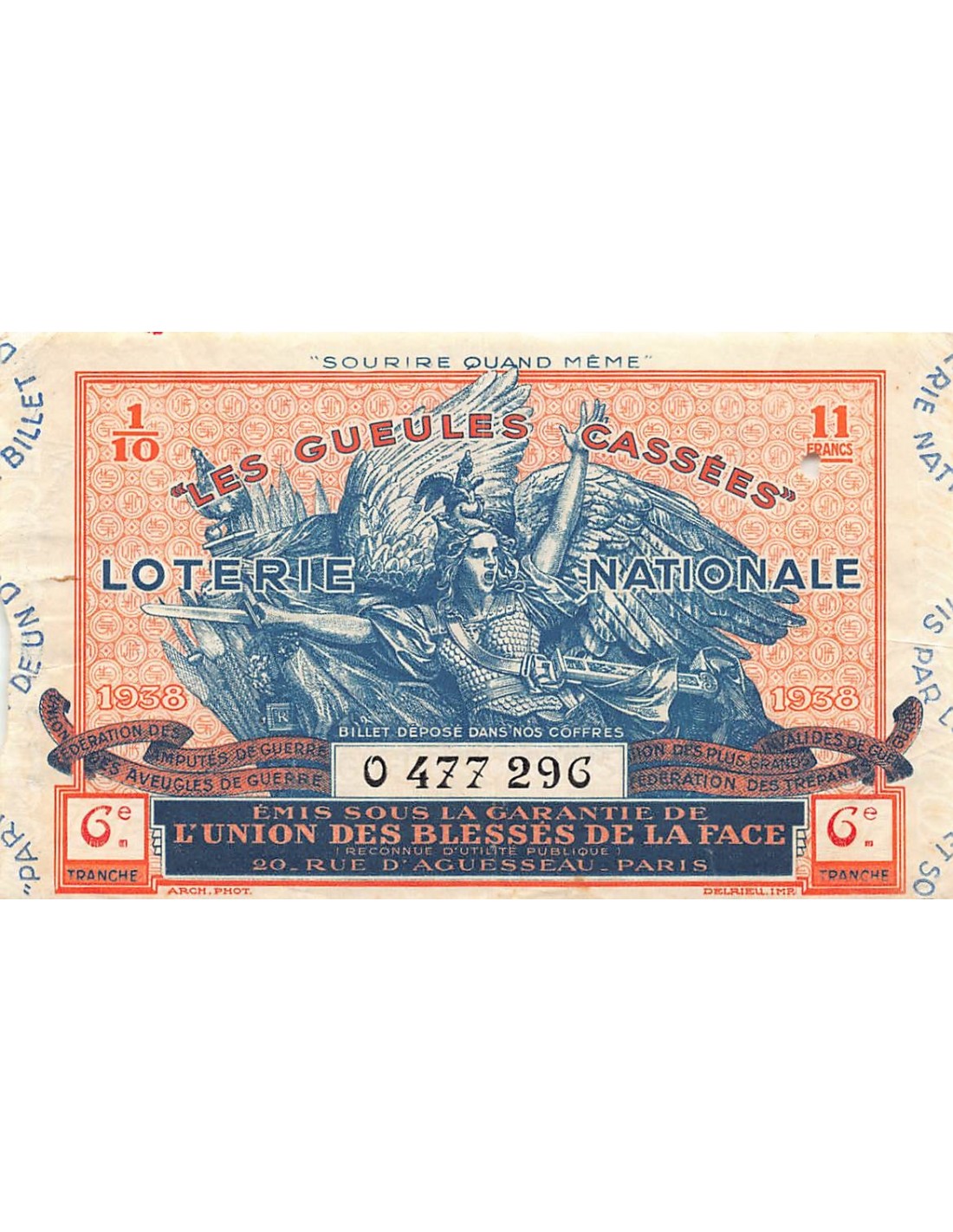 Billet de Loterie Nationale, Les Gueules Cassées - 1938
