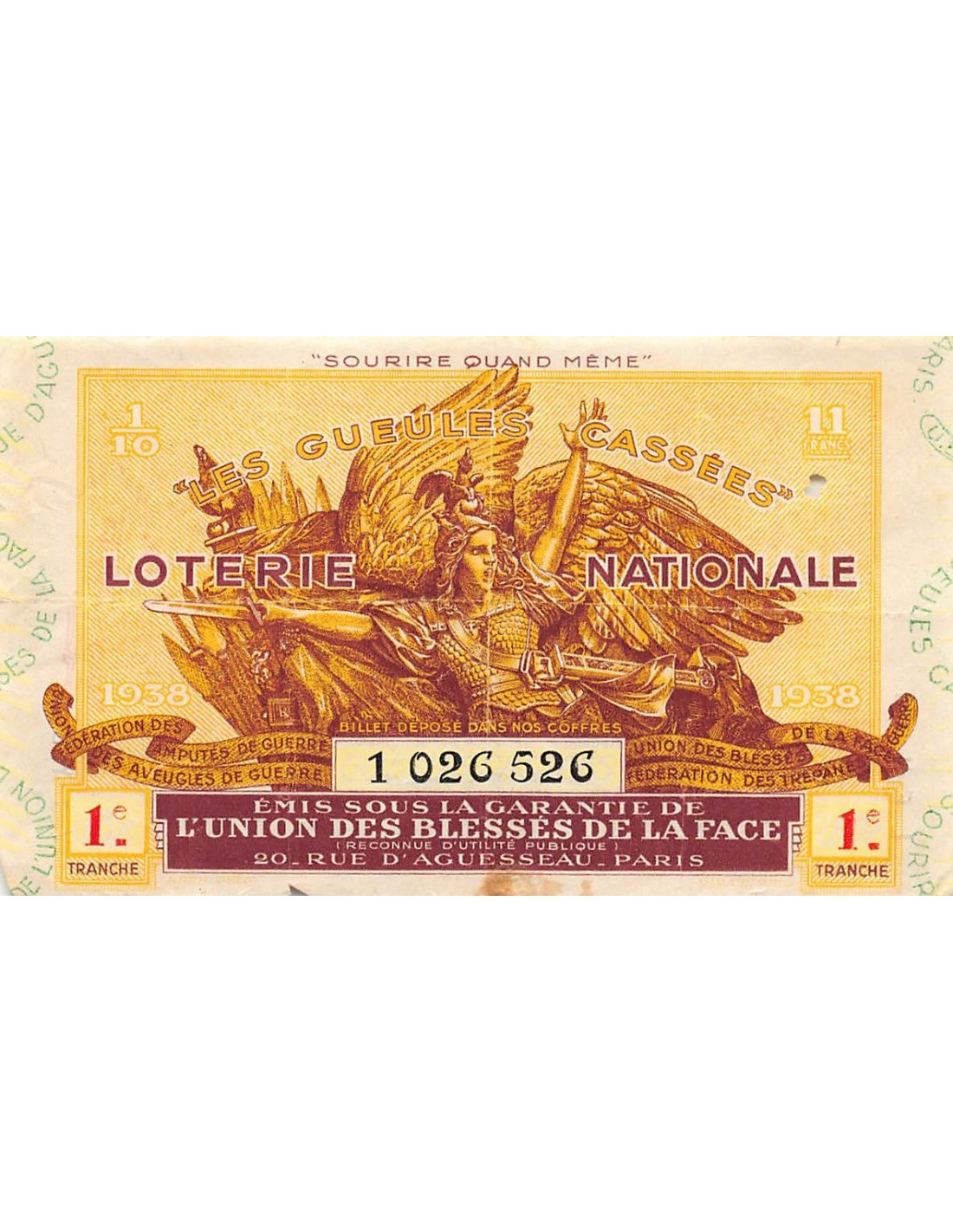 Billet de Loterie Nationale, Les Gueules Cassées - 1938