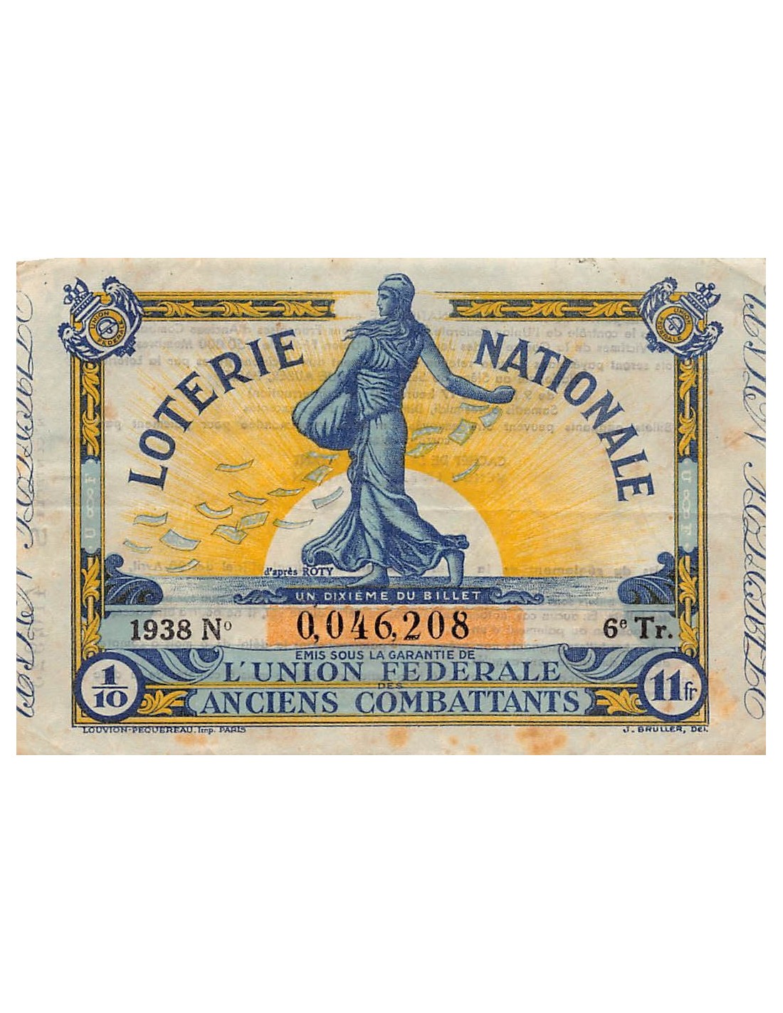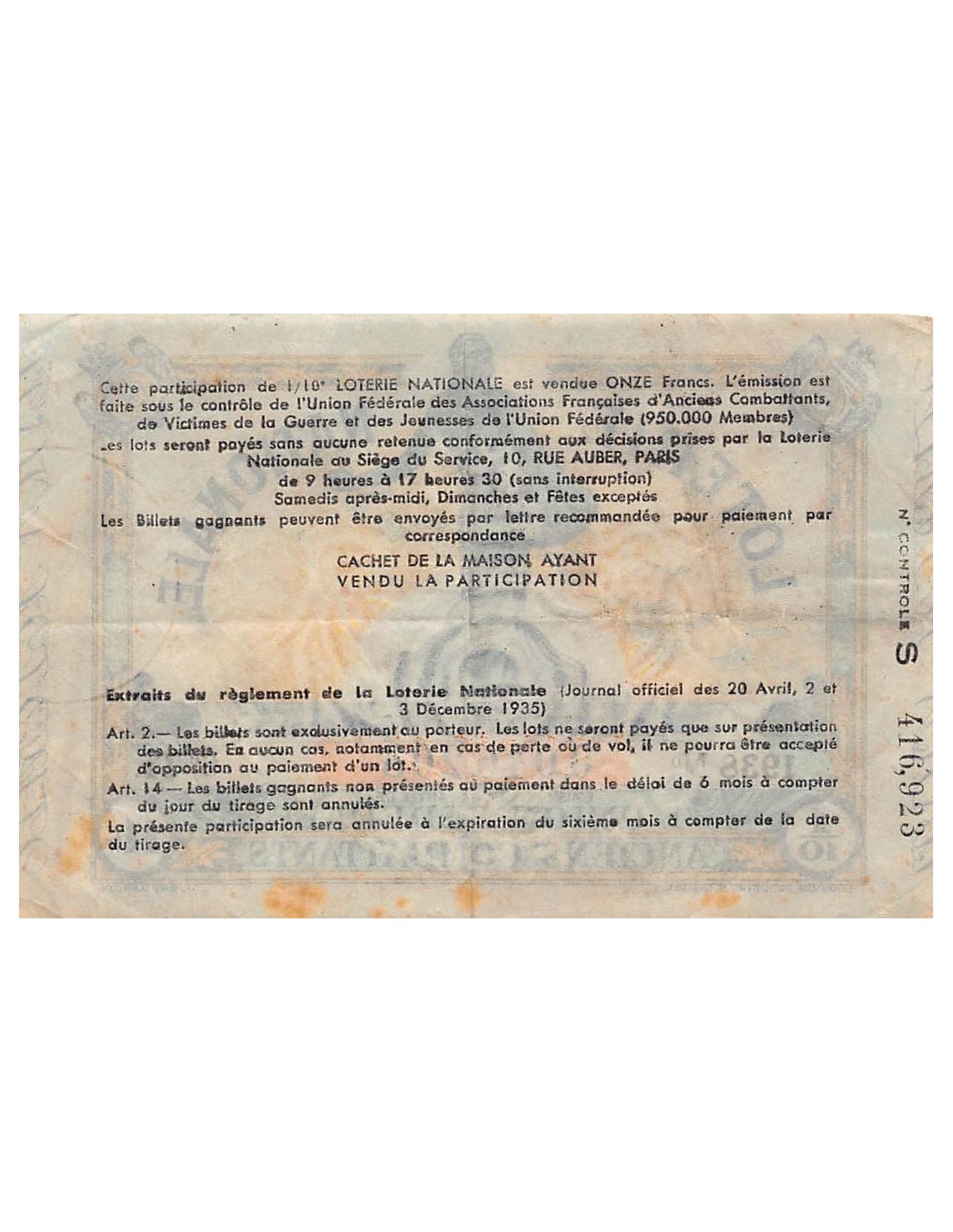 Billet de Loterie Nationale, Union Fédérale Anciens Combattants - 1938