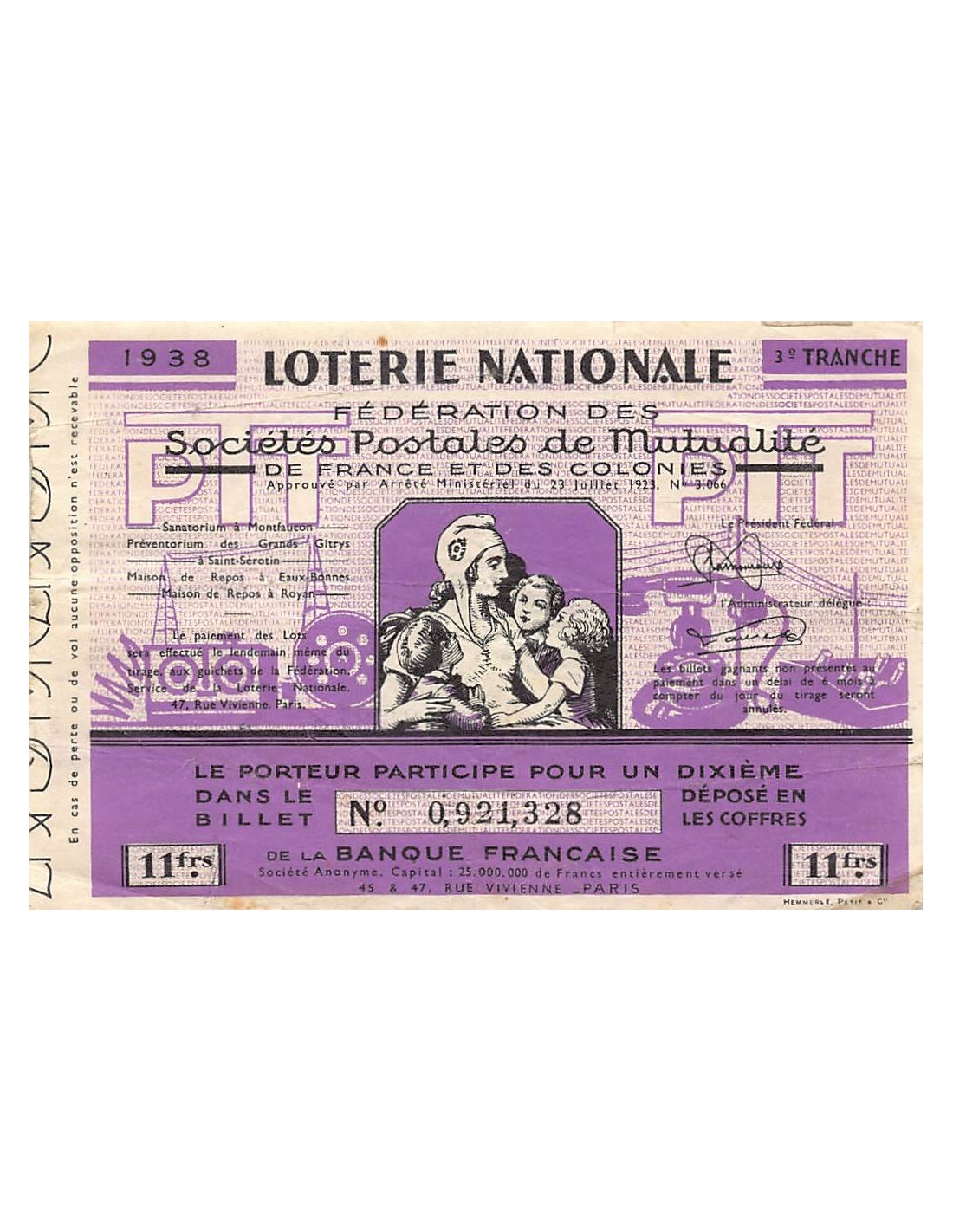 Billet de Loterie Nationale, Sociétés Postales de Mutualité - 1938