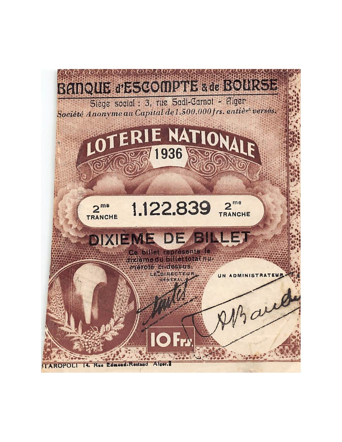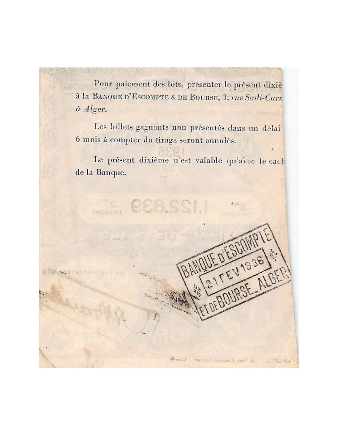 Billet de Loterie Nationale, Banque d'escompte & bourse, ALGER - 1936