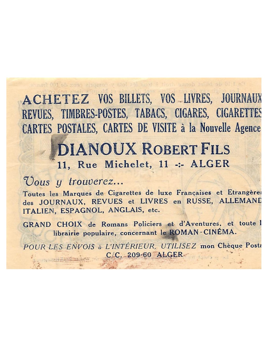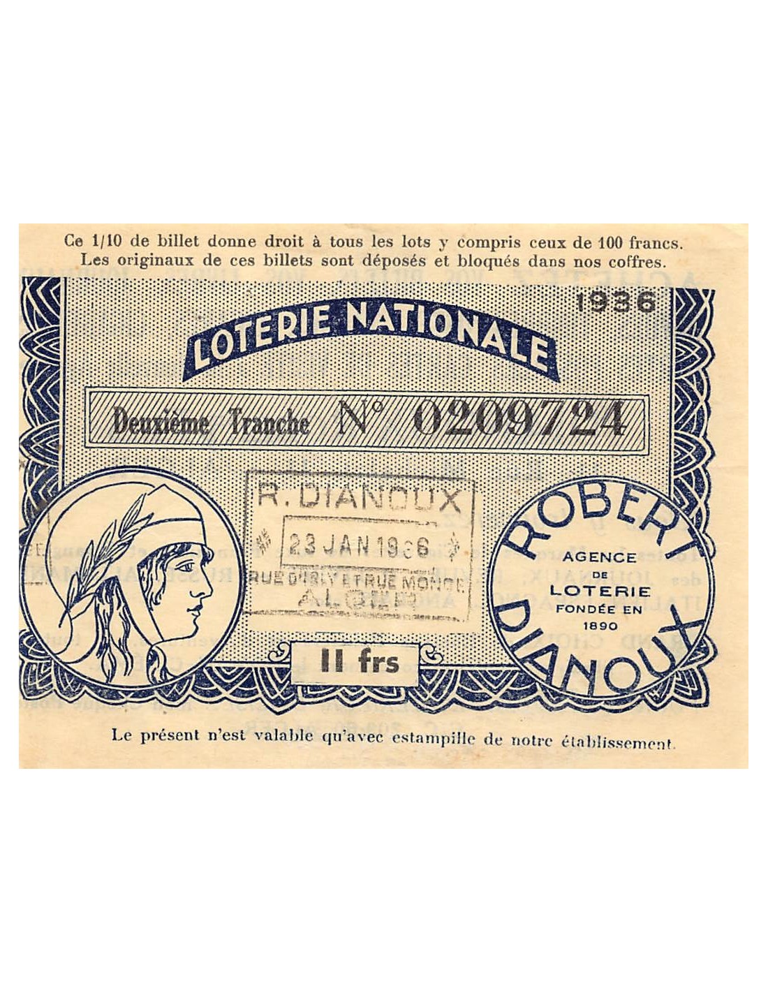 Billet de Loterie Nationale, Robert Dianoux, ALGER - 1936
