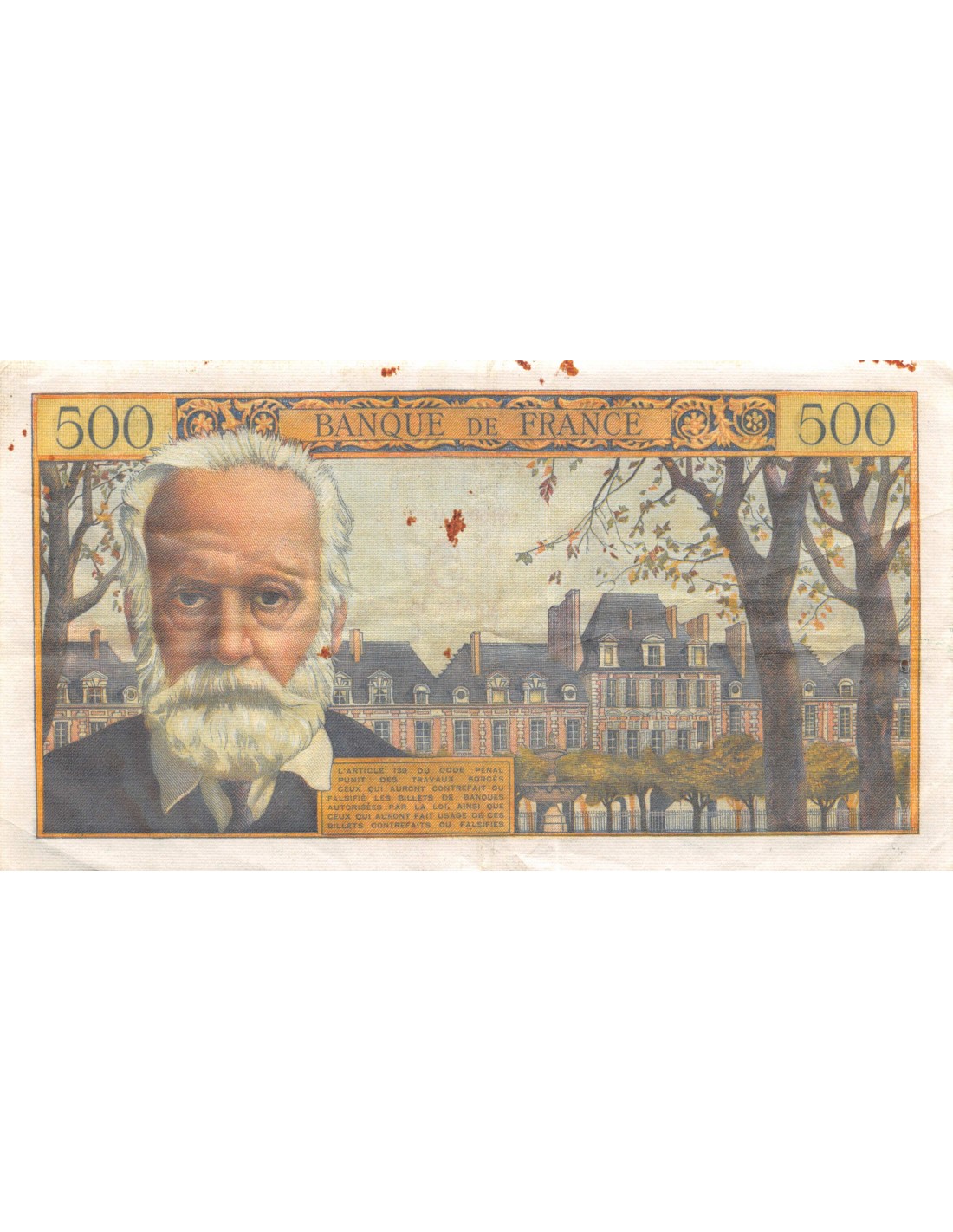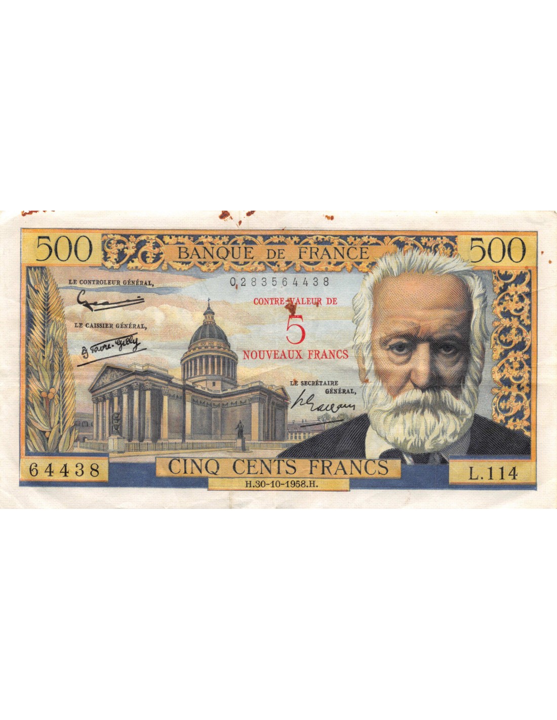 FRANCE, VICTOR HUGO - 5 NF / 500 FRANCS SURCHARGE 30.10.1958 - SÉRIE L.114 - TB+