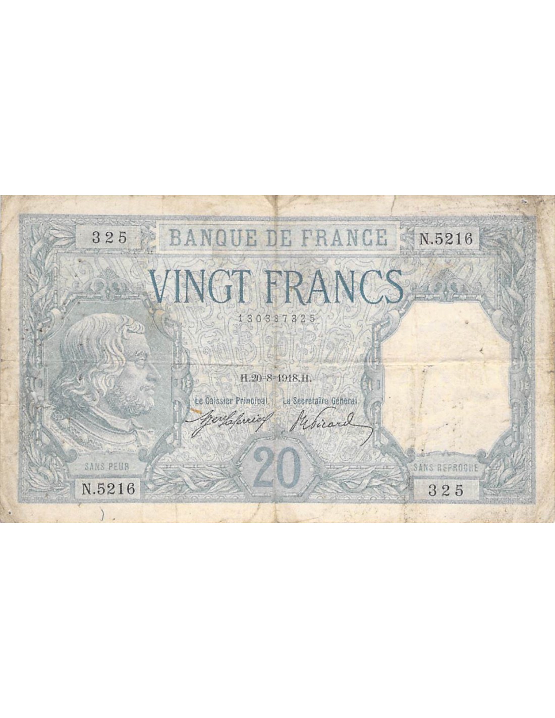 FRANCE - 20 FRANCS BAYARD 20/08/1918 - SÉRIE N.5216 - TB