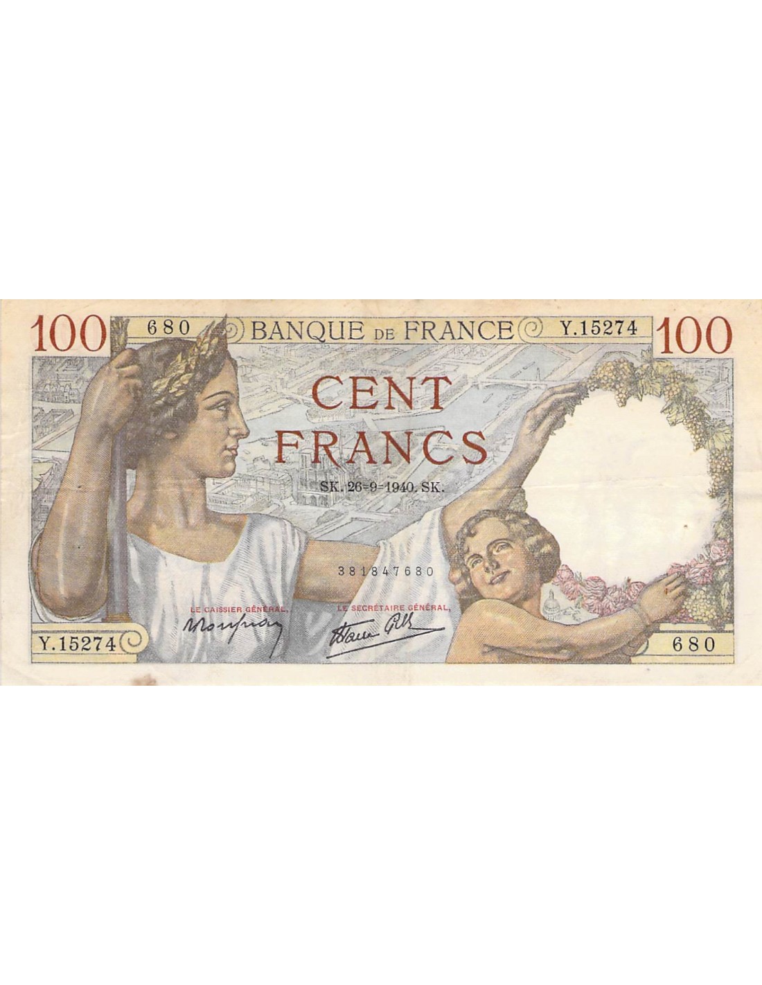 FRANCE, SULLY - 100 FRANCS 26/09/1940 - SÉRIE Y.15574 - TTB