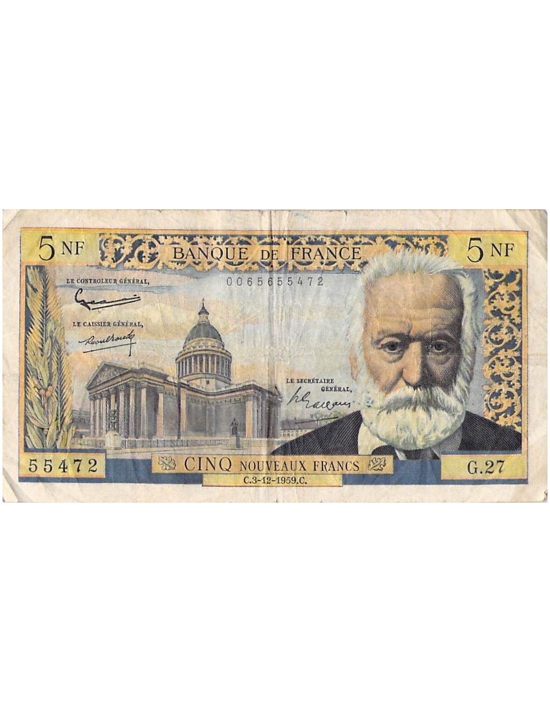 FRANCE, VICTOR HUGO - 5 NF 03/12/1959 - SÉRIE G.27 - B+