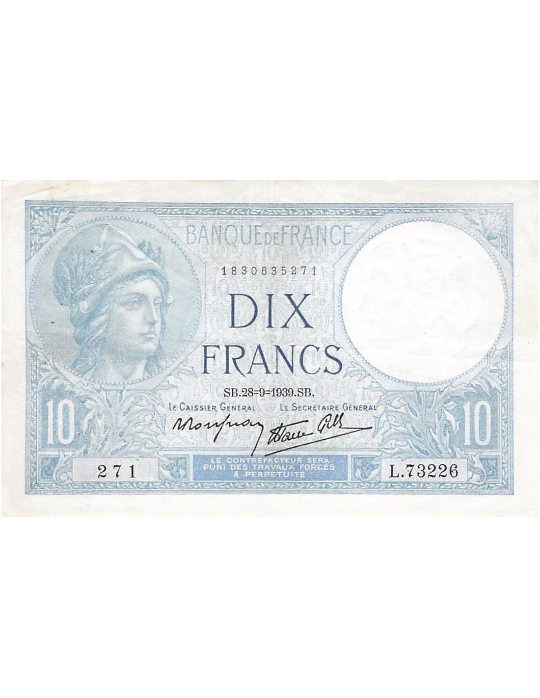 FRANCE - 10 FRANCS MINERVE 28/09/1939 - TTB