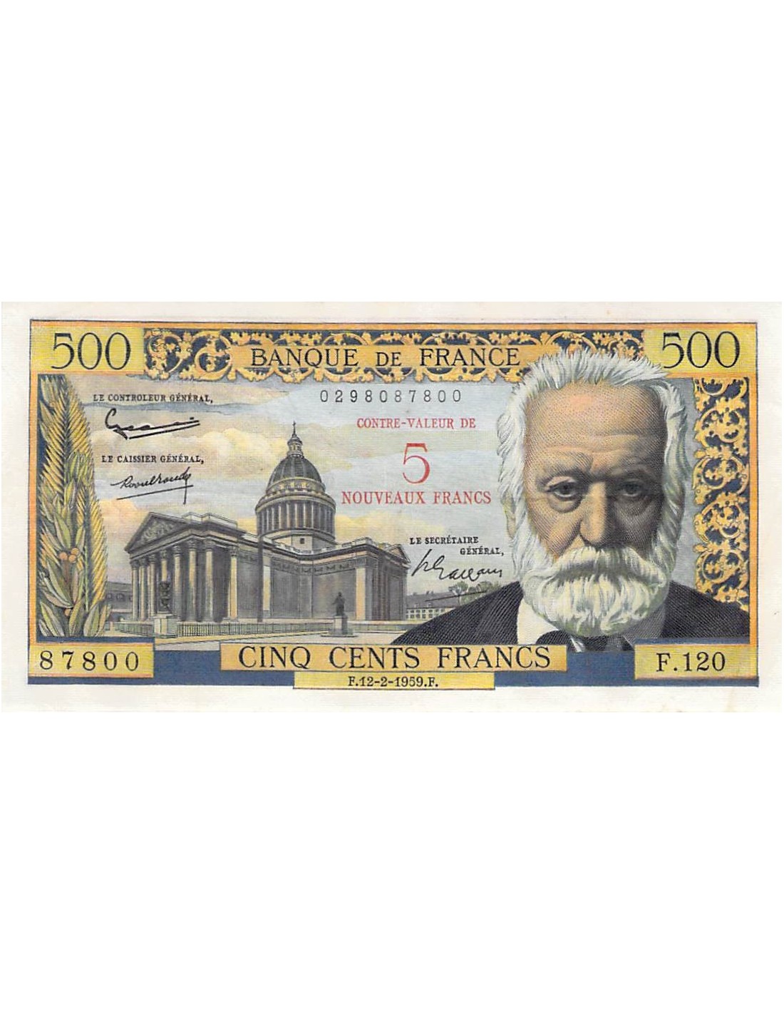 FRANCE, VICTOR HUGO - 5 NF / 500 FRANCS SURCHARGE 12/02/1959 - SÉRIE F.120 - TTB+
