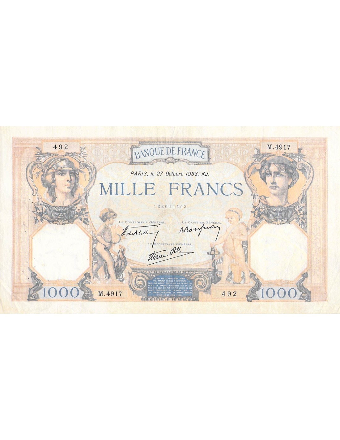 FRANCE, CÉRÈS ET MERCURE - 1000 FRANCS 27/10/1938 - TTB