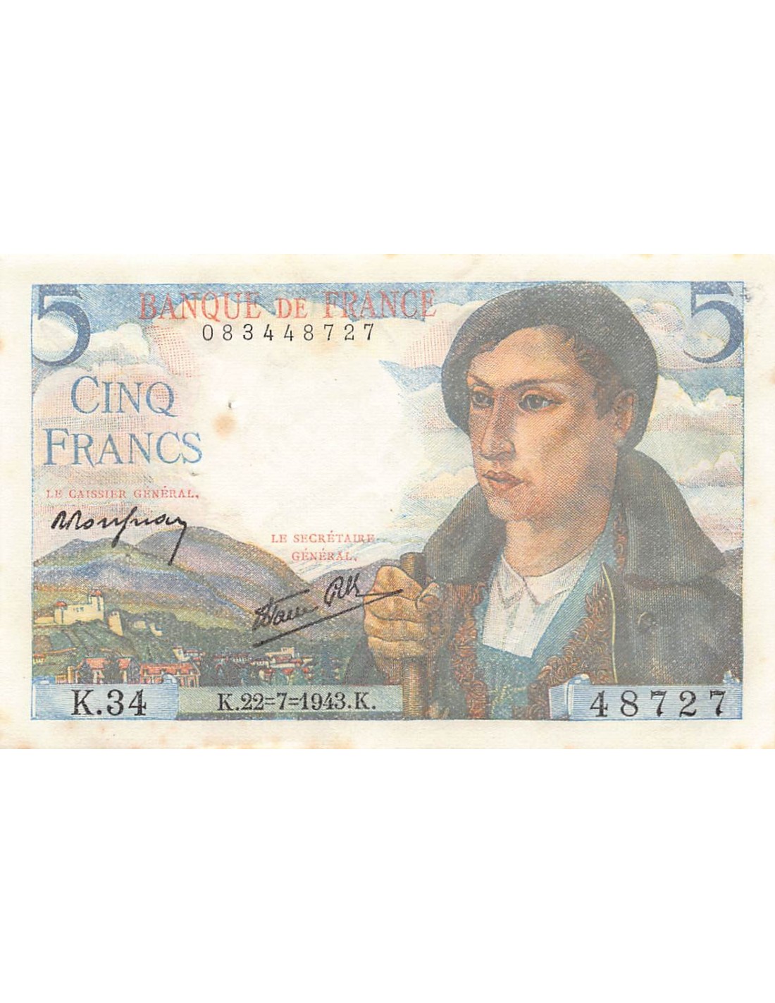 FRANCE, BERGER - 5 FRANCS 22/07/1943 - SÉRIE K.34 - TTB+
