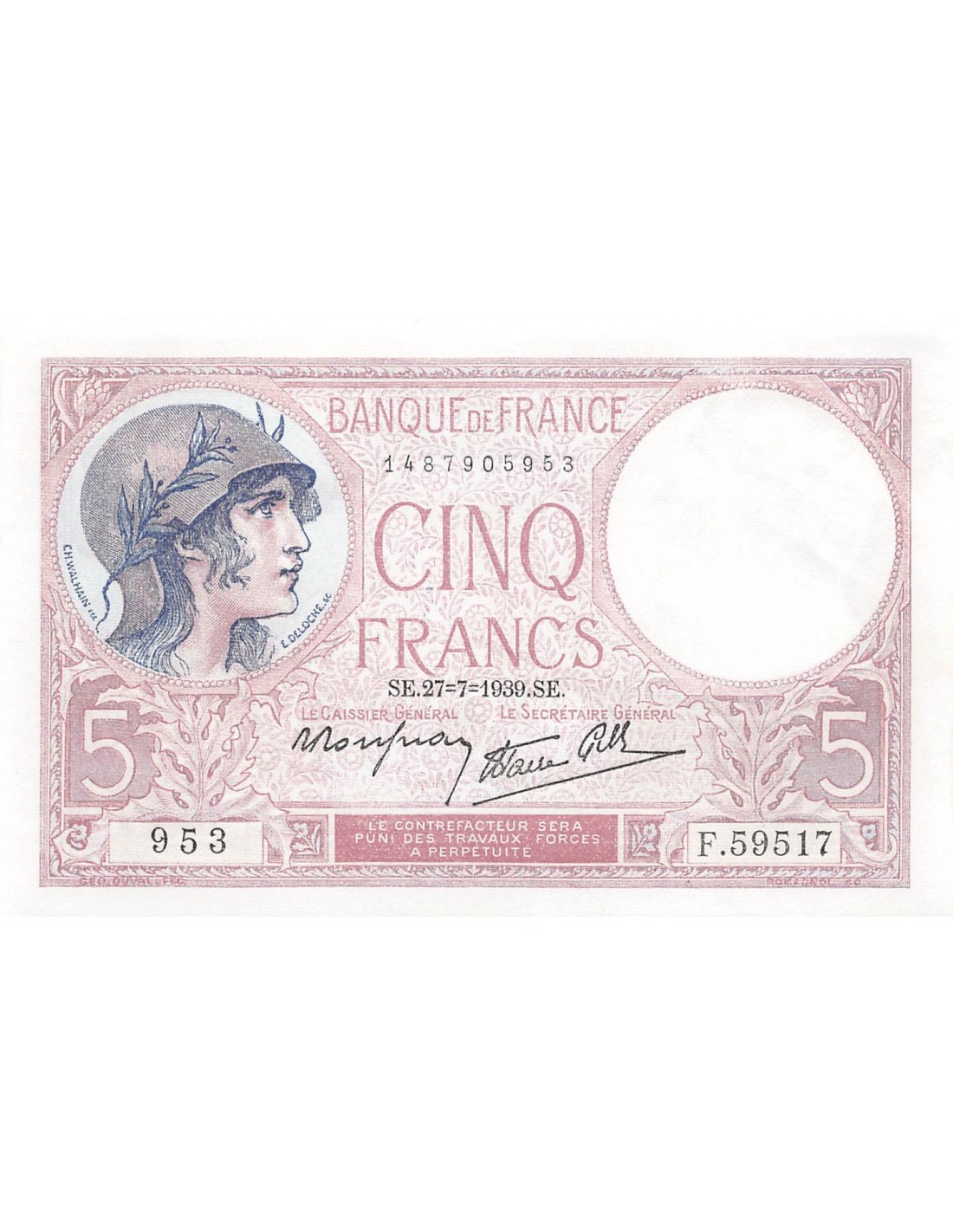 FRANCE, VIOLET - 5 FRANCS 27/07/1939 - SUP