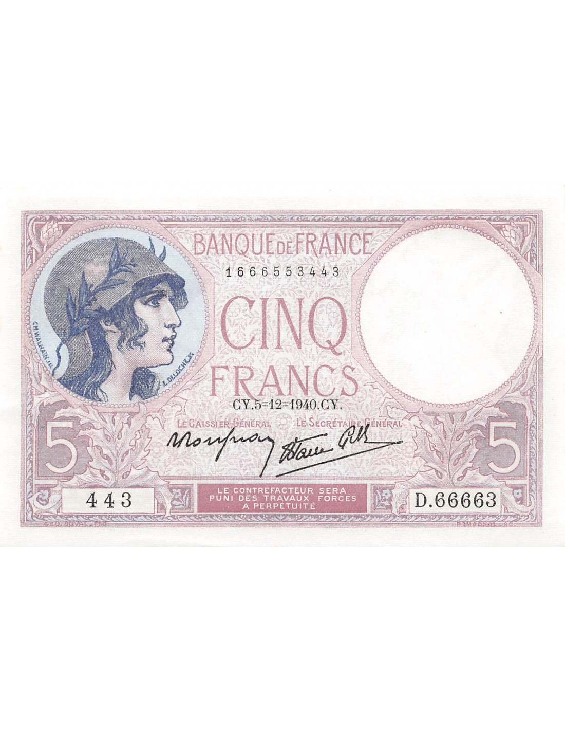FRANCE, VIOLET - 5 FRANCS 05/12/1940 - SUP+