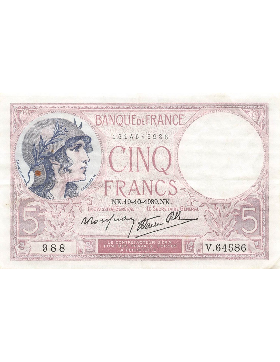 FRANCE, VIOLET - 5 FRANCS 19/10/1939 - TTB+