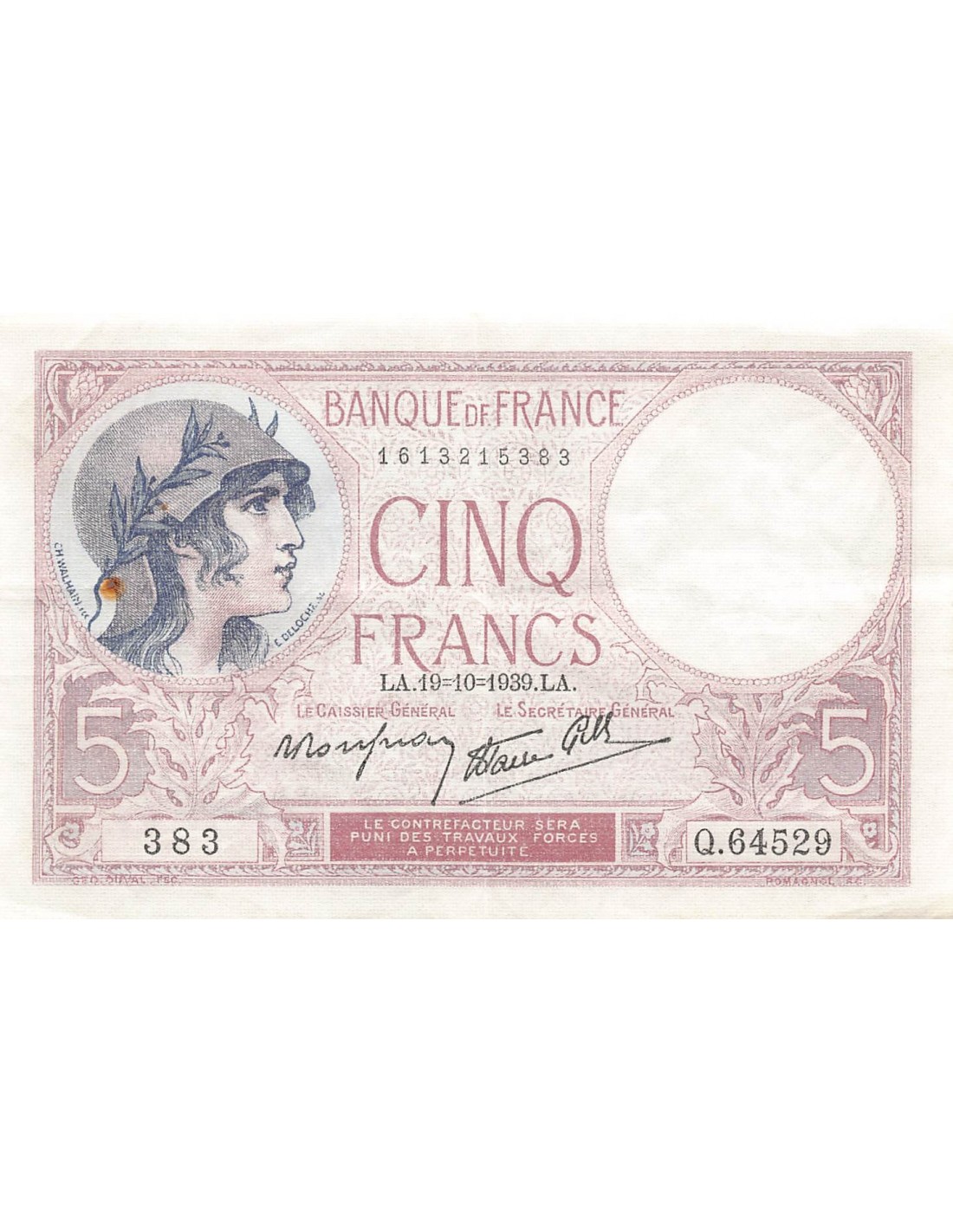 FRANCE, VIOLET - 5 FRANCS 19/10/1939 - TTB+