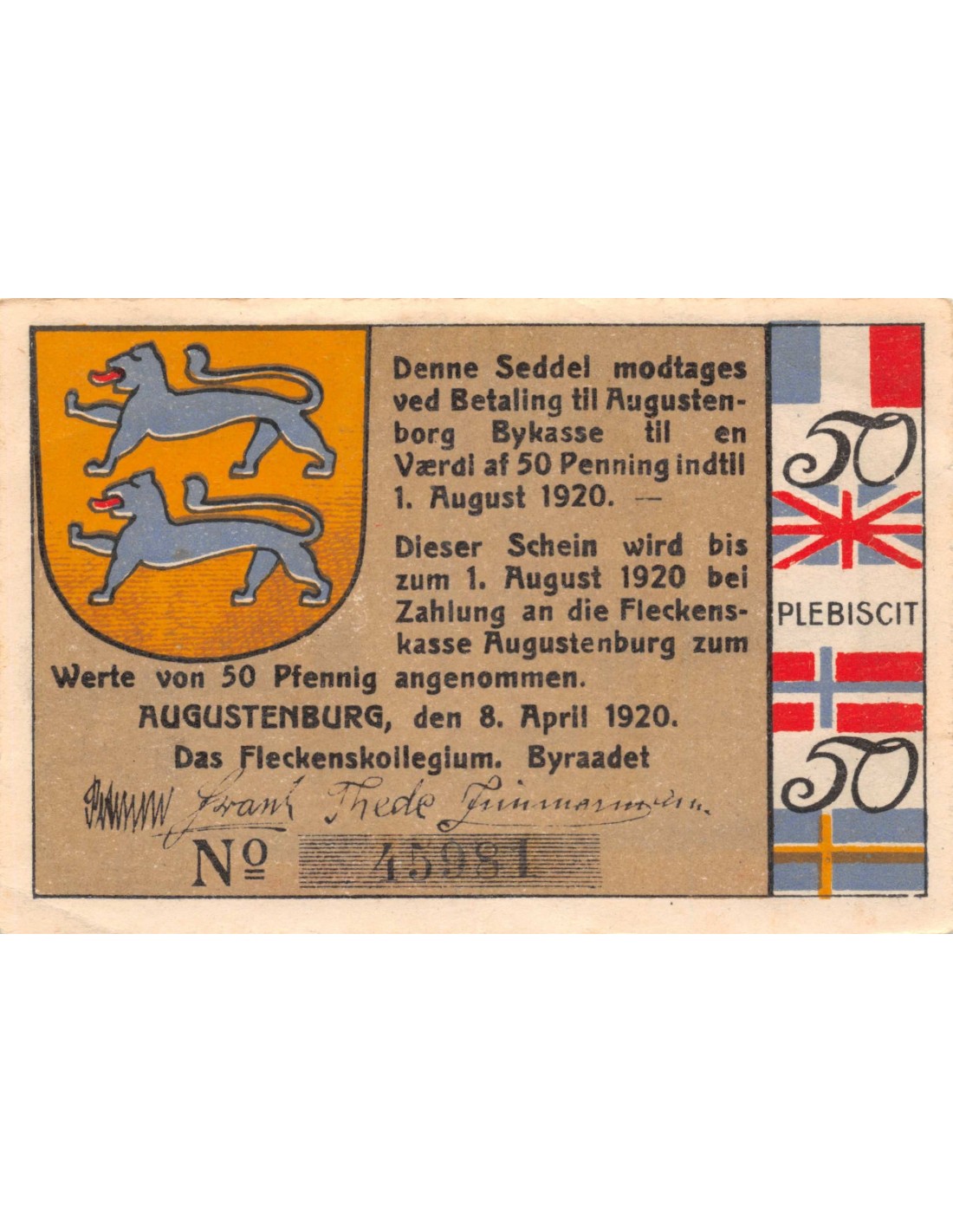 DANEMARK, ALLEMAGNE, AUGUSTENBORG - 50 PFENNIG 1920