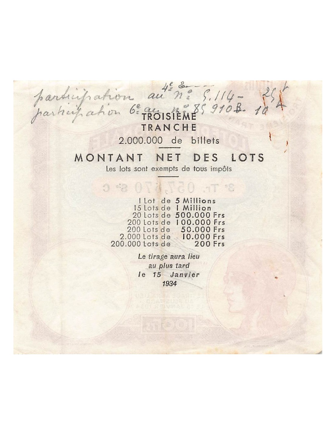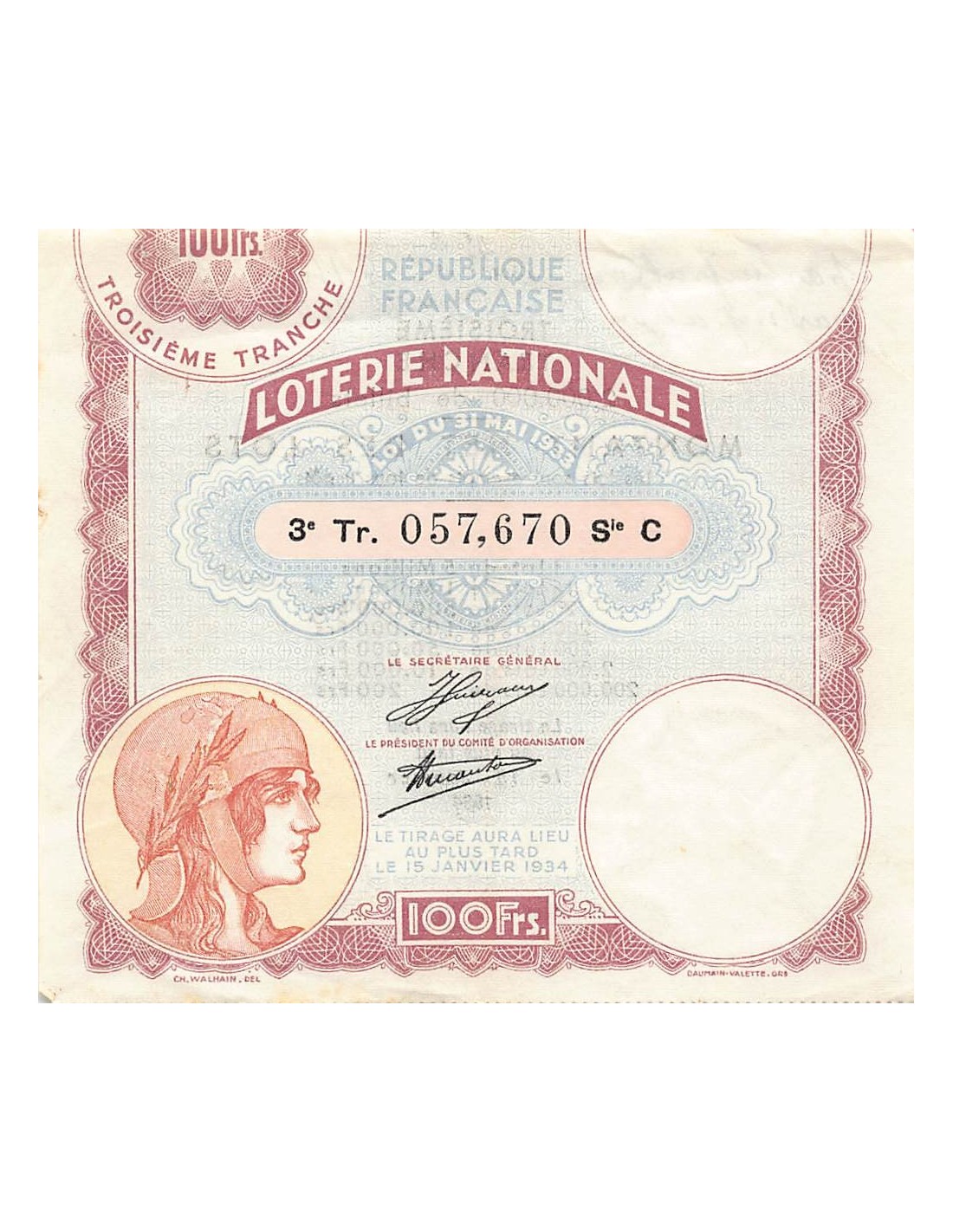 Billet de Loterie Nationale, 100 FRANCS 15 JANVIER 1934