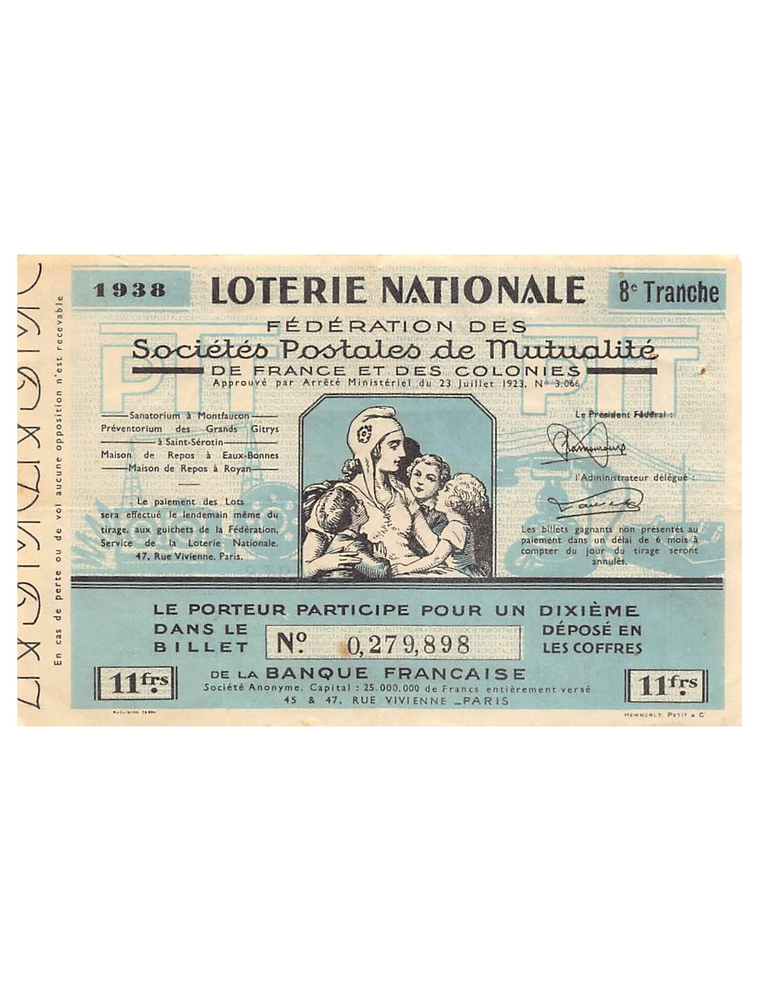 Billet de Loterie Nationale, Sociétés Postales de Mutualité - 1938