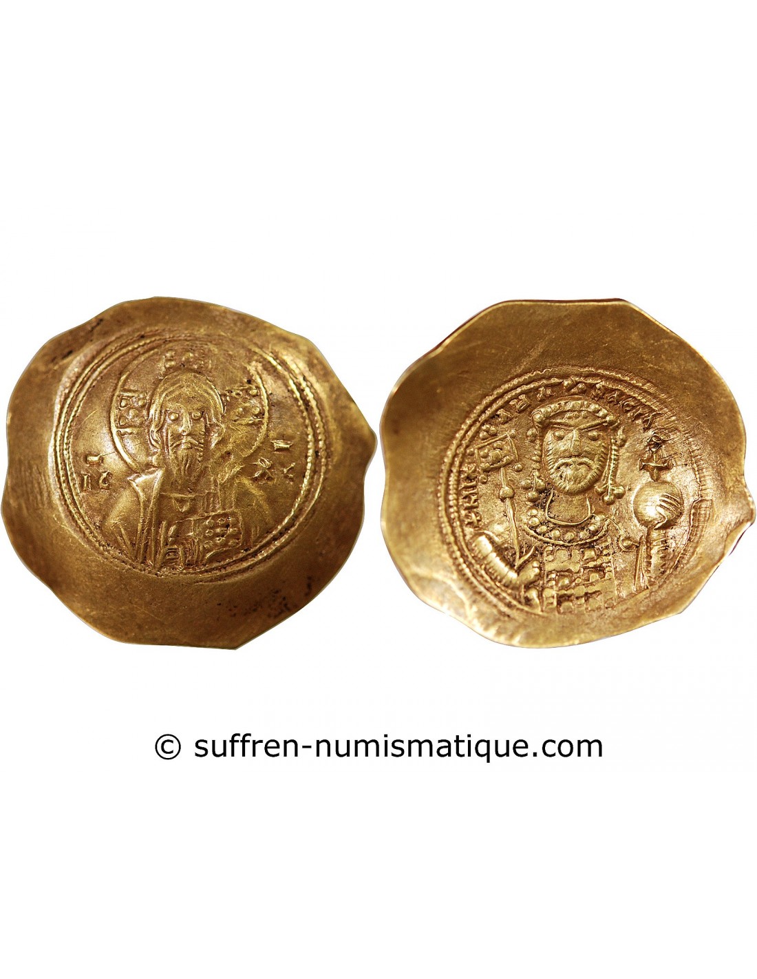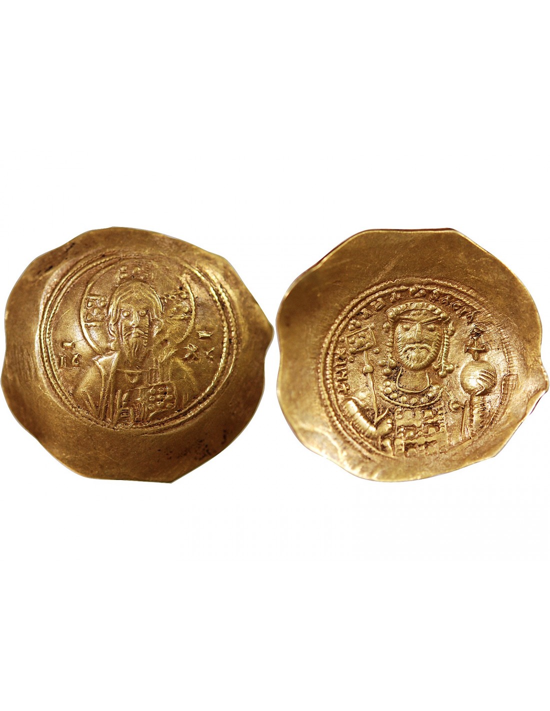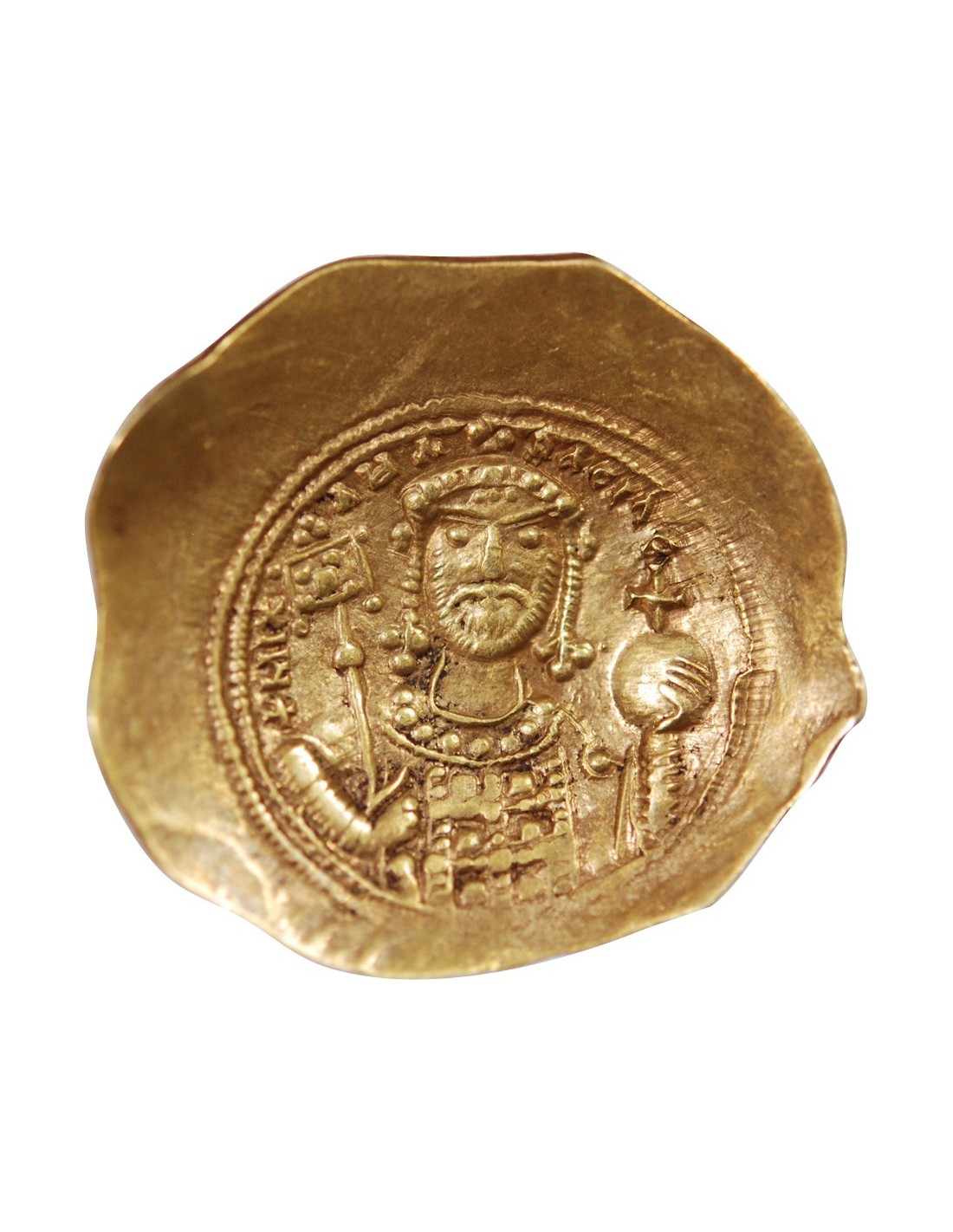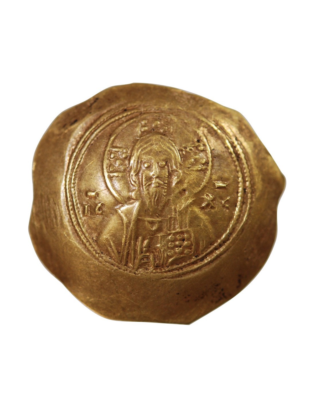 Le Christ avec le nimbe crucigère trônant de face vêtu du pallium et du colombium bénissant de la main droite et tenant les Évangiles de la main gauche