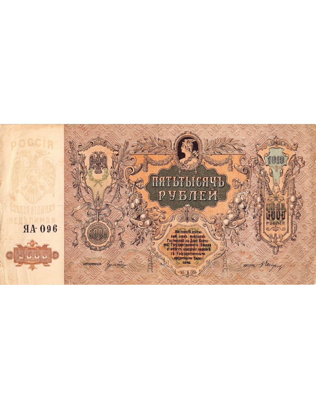 RUSSIE DU SUD, HAUT COMMANDEMENT DES FORCES ARMEES - 5 000 ROUBLES 1919